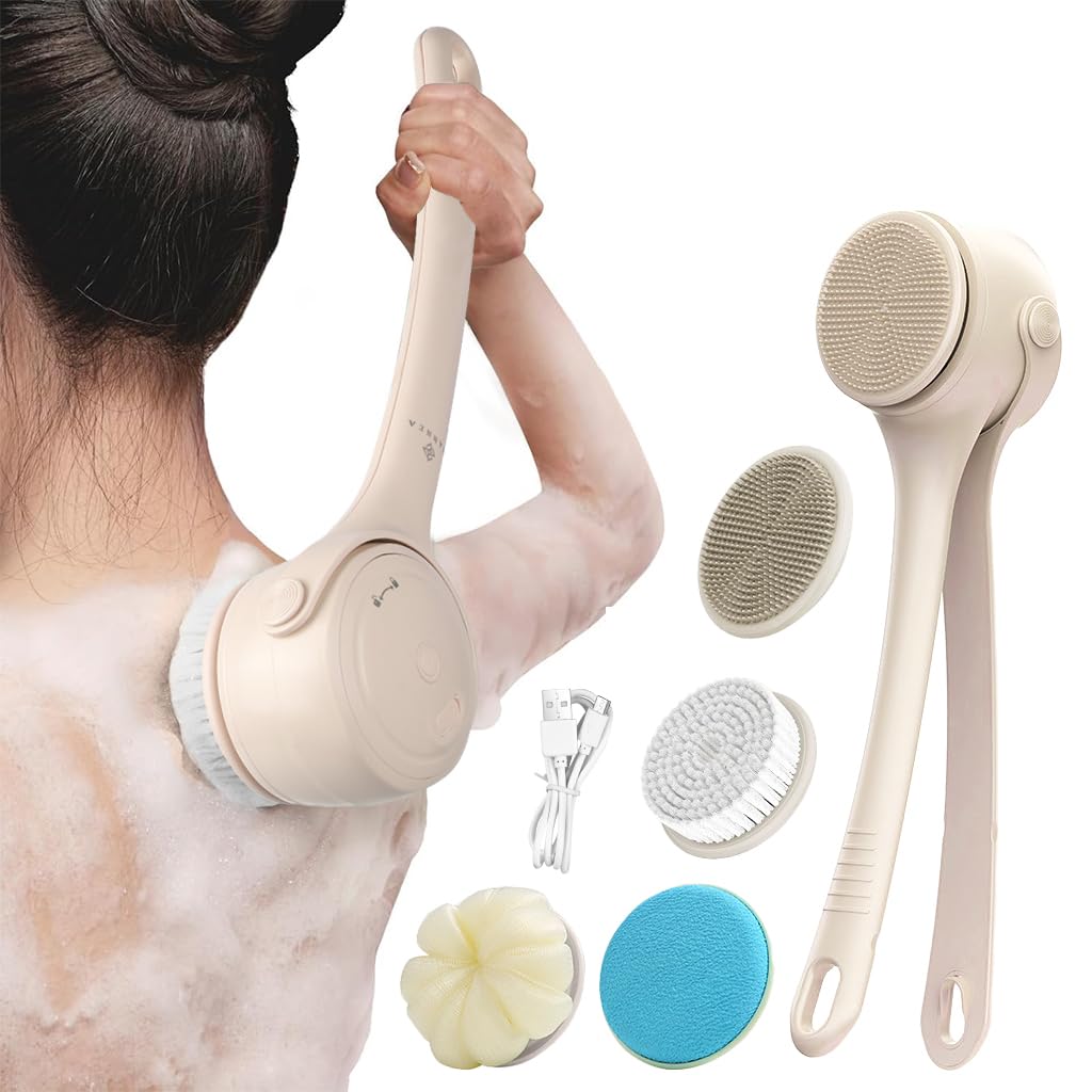 HANNEA Electric Bath Brush with 4 Heads and 2 Modes for Exfoliation and Dual Handle Design