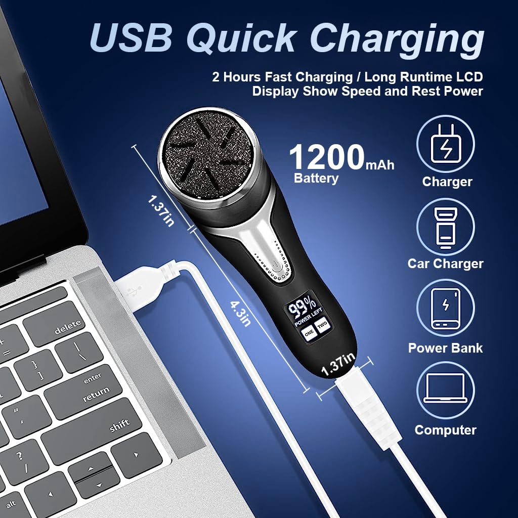 - ONE BUTTON CONTROL & LCD DISPLAY: One button control, easy and handy operation for all. The LCD display can show you the battery situation, reminding you to charge in time. The electric foot file have a built-in 1200mAh rechargeable battery, USB charging and long work duration after fully charged