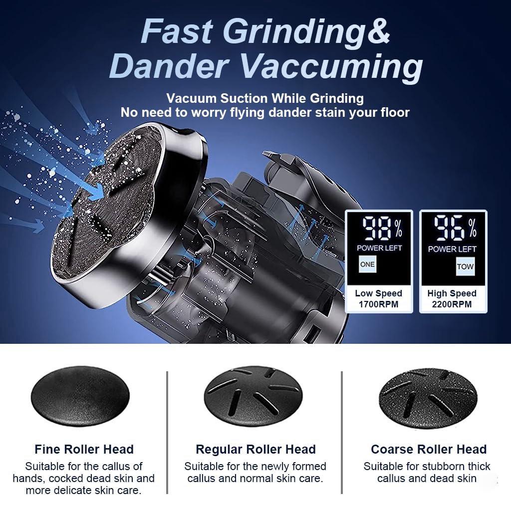 - 3 GRINDING HEADS: Coming with three grinders head for changing different polishing fineness, meets different skin situation and foot care needs. This electric foot callus remover is suitable for both men and women. The unique grooves on the grinder sheet is also helpful for making the dust stay in dust box instead of flying out, easy to clean.