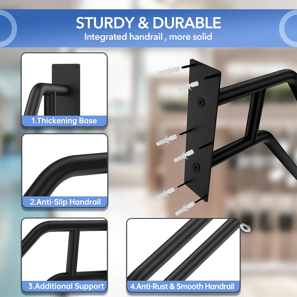 - SAFETY GRAB BAR FOR PEOPLE UP AND DOWN STAIRS: This U shaped wall mounted black handrail for outdoor steps is made of durable heavy duty wrought iron, which is hard and resistant to deformation. This hand rail grab bars for toilet senior citizens comes with high-temperature baking paint treatment, impact and corrosion resistance to support long-term using and is suitable for any weather.