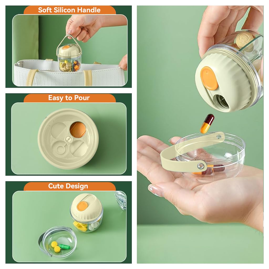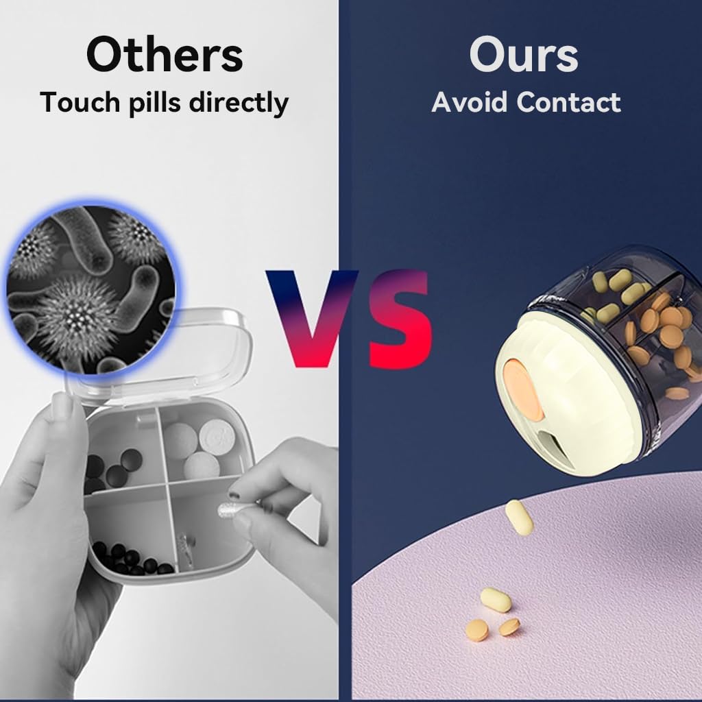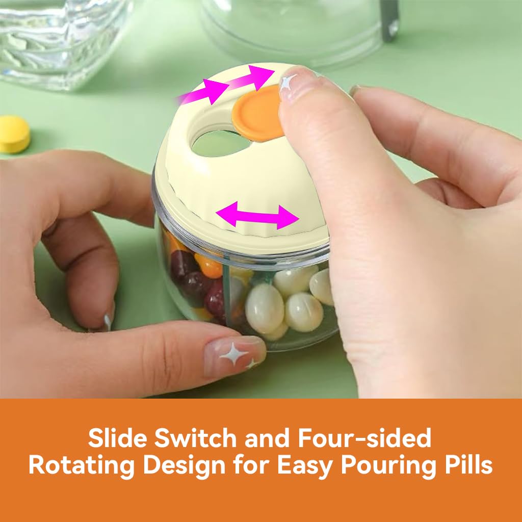 - LARGE CAPACITY PILL ORGANIZER BOX: This travel pill box stands out with its unique cup-like structure, enhanced by a rotatable cover featuring a small opening and a sliding lid. This smart design allows you to easily rotate to the desired compartment and conveniently dispense your pills without fuss, making medication management both simple and efficient.