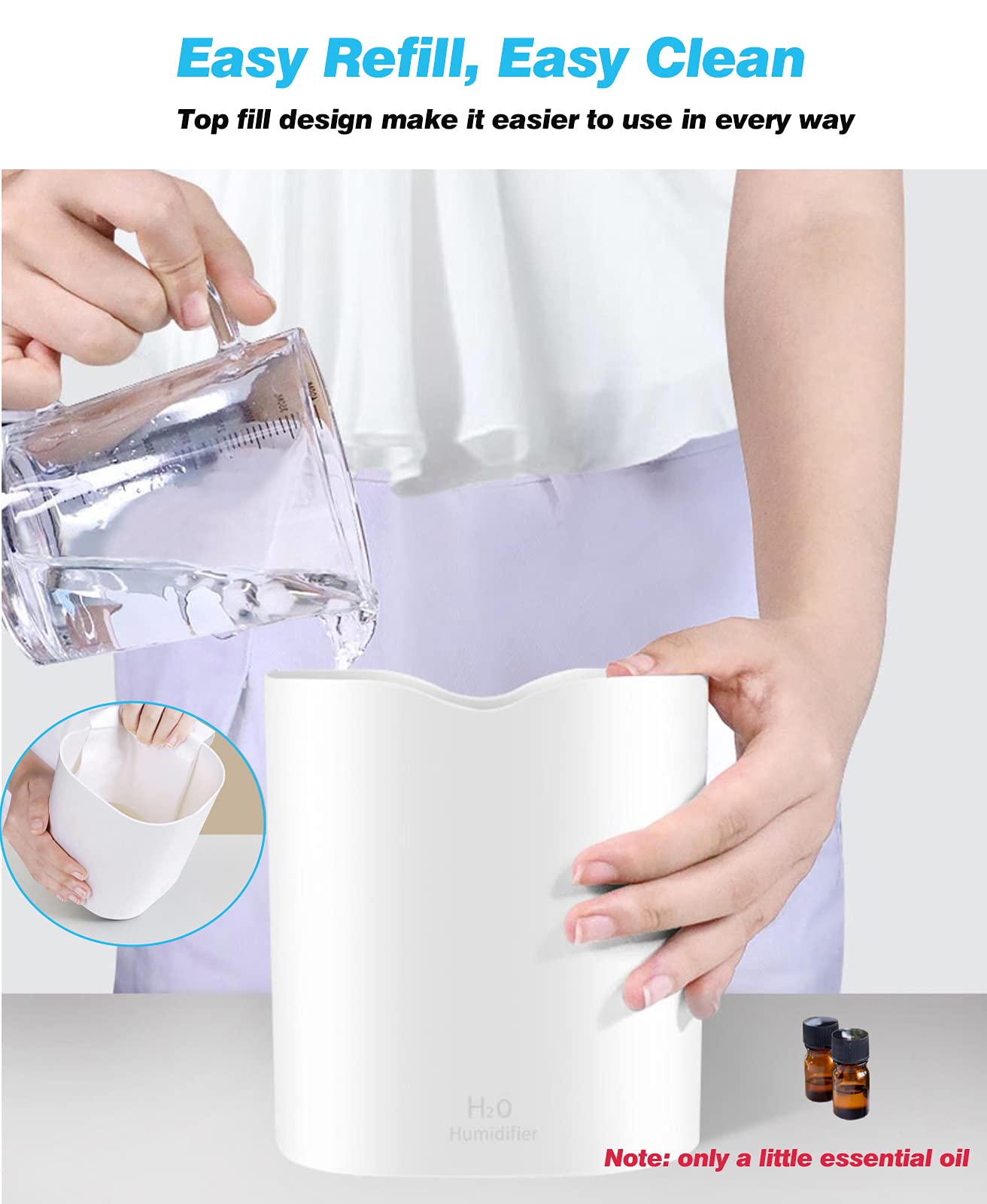- [ 2L EXTRA LARGE WATER TANK ] -- Fine spray nozzle can moisture the air better,will not form big water drop ,better using experience. 2L water tank capacity with can use for longer,and saving the trouble of frequently adding water. Besides, it will shut down automatically when the water is below the safety line, you don't have to worry about the humidifier being damaged in the absence of water. You can use it at night without worrying about safety.