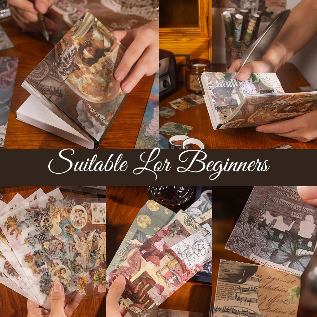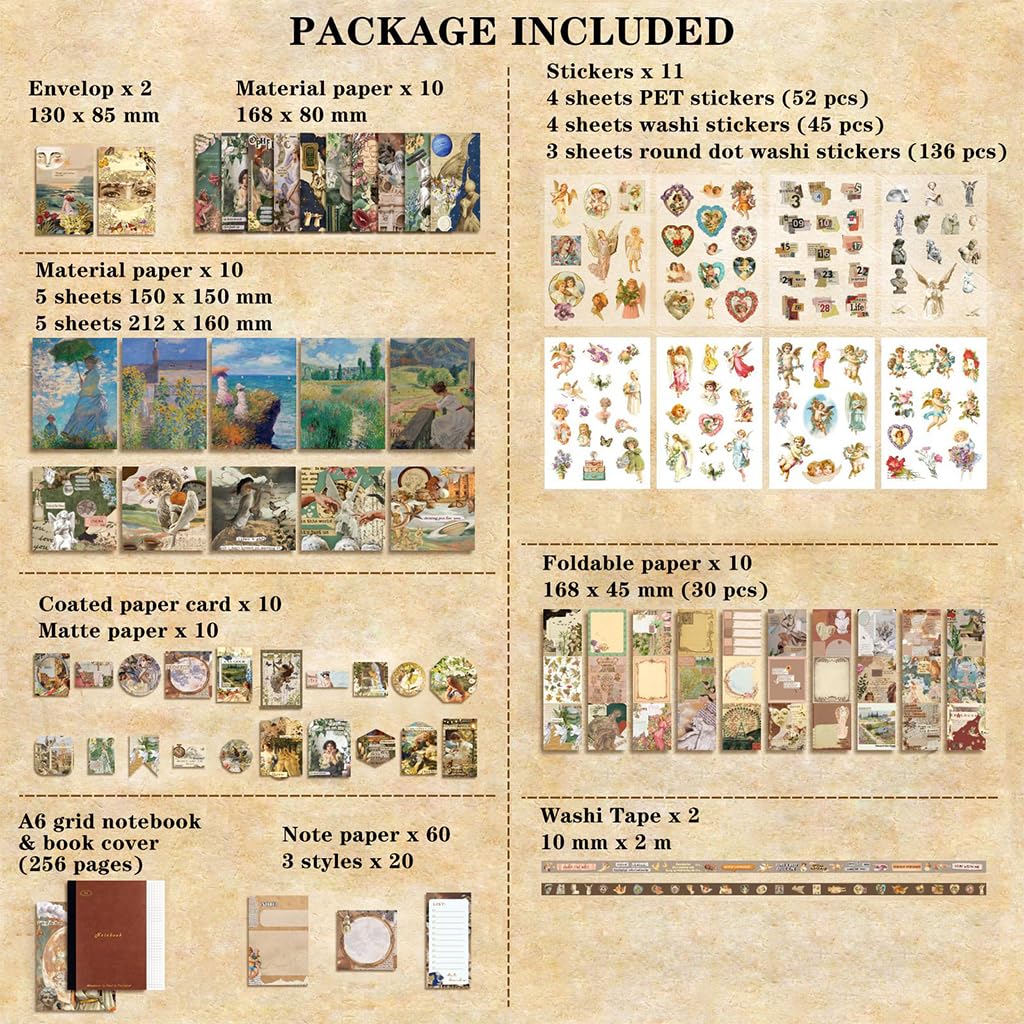 - WHAT YOU RECEIVE: Our 232 pcs vintage scrapbooking supplies kit included: 1 x A6 grid notebook + book cover (256 pages), 20 x material paper, 10 x matte paper, 10 x coated paper card, 60 x note paper, 4 x PET stickers (52 pieces), 4 x washi stickers (45 pieces), 10 x foldable paper (30 pieces), 2 x washi tape, 2 x envelopes. A large collection of art journaling supplies to build your vintage junk journal.