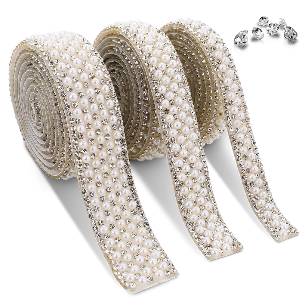 HASTHIP Pearl Rhinestone Ribbon Tape for DIY Crafts featuring Self Adhesive Design and 3 Rolls 1 Yard Each