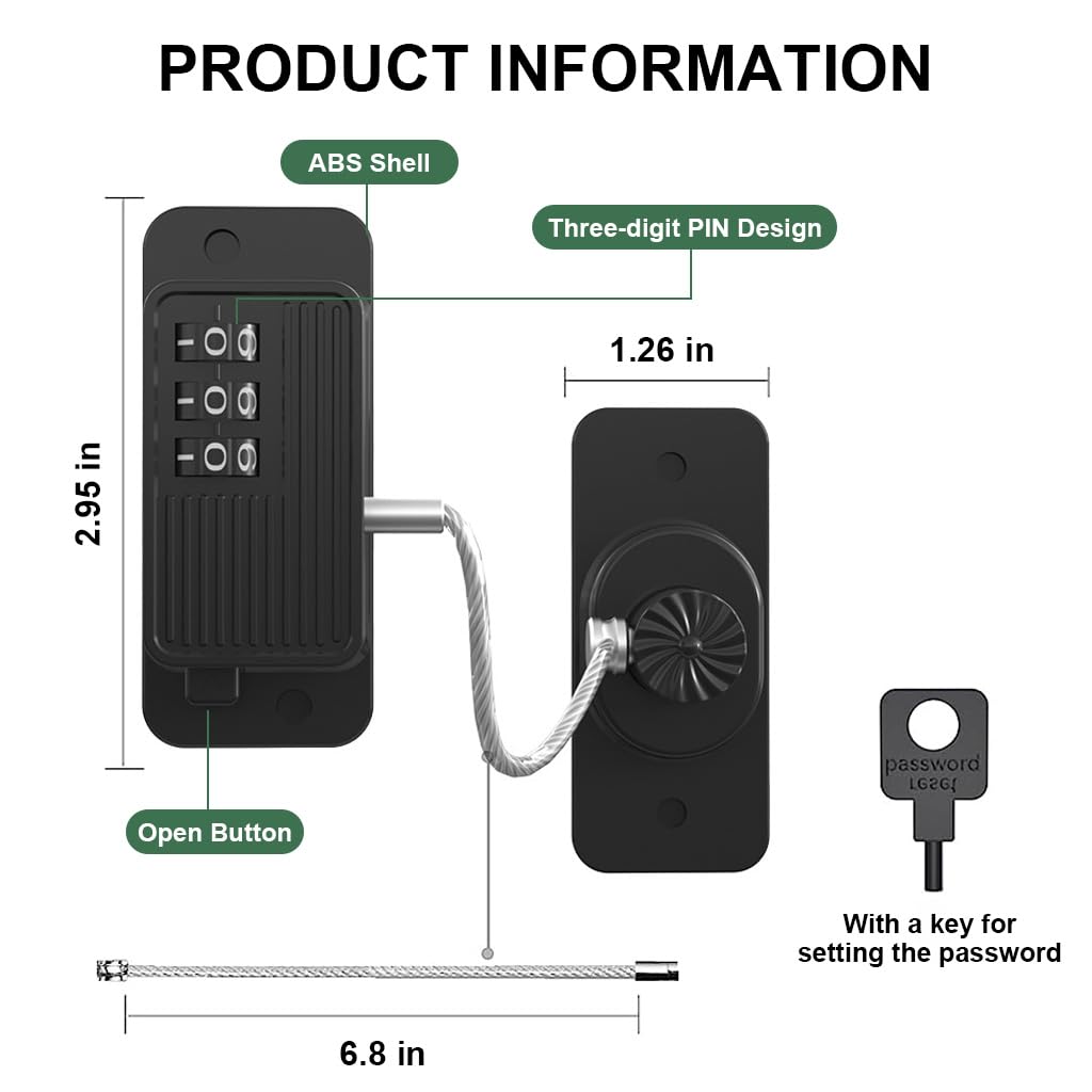 - RELIABLE PASSWORD SAFEGUARDING LOCK: Our safety door lock is made of high-quality ABS material + stainless steel wire + zinc alloy. The premium black color can match almost all furniture, and the steel wire made of multi-strand steel wire makes the fridge lock more solid. The back is made of upgraded glue to protect the refrigerator while not easy to fall off.