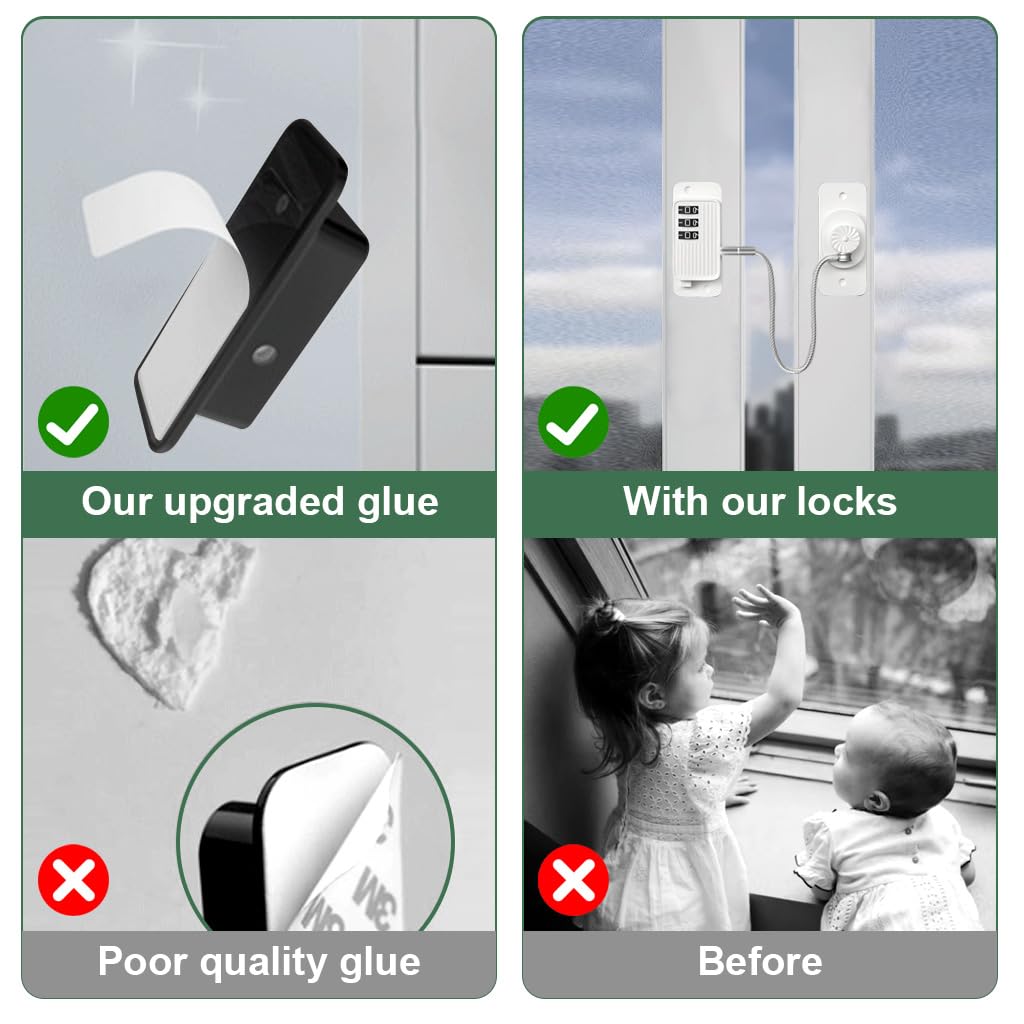 - EASY TO INSTALL: You don't need to drill any holes or screws. The safety door lock comes with a strong adhesive on the back, just clean the area where you apply the lock and stick it where you want it. An upgraded film so you don't have to worry about it damaging or uglifying your fridge or any furniture.