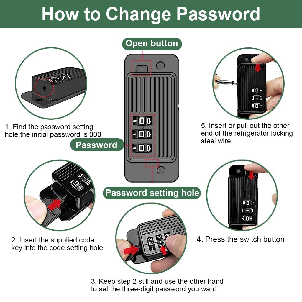 - HOW TO SET THE PASSWORD: Step1. Make sure the initial password on the top of the refrigerator lock is 0-0-0. Step2. Find the password hole to set. Step3. Insert the key into the combination hole and hold it still. Step4. Use your other hand to set the three-digit code you want (Note: Please remember the password you set)