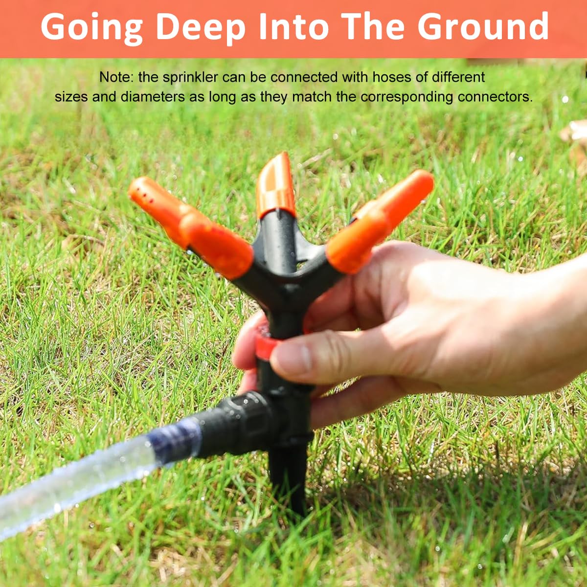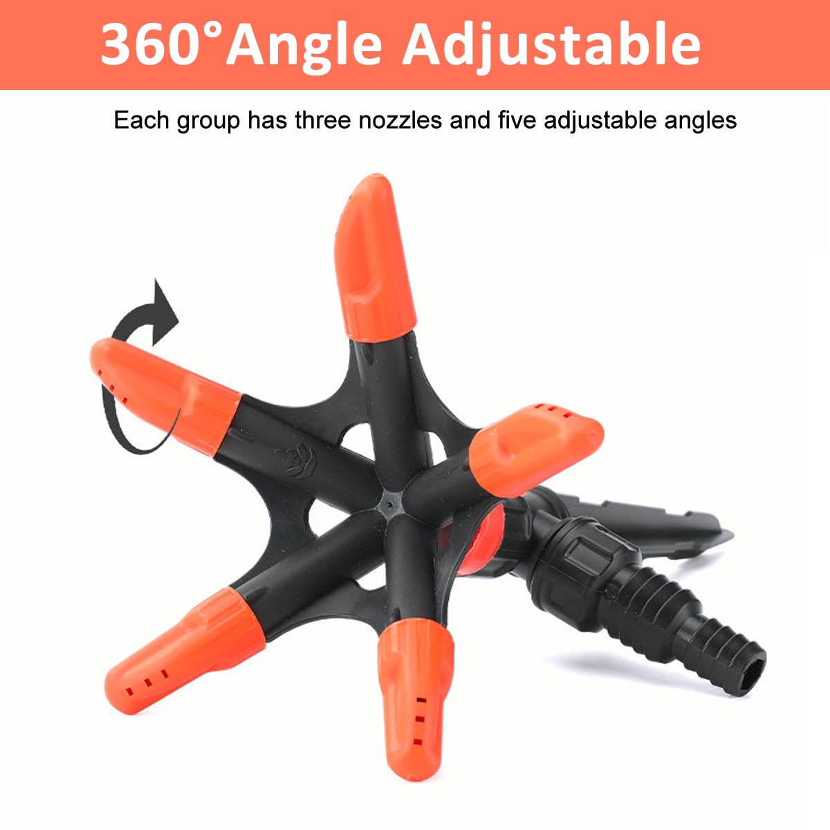 - MULTI NOZZLE WATER SPRINKLER: This lawn watering sprinkler head is designed to deliver a comprehensive 360-degree watering experience, thanks to its 5 3-hole water outlets and flexible direction adjustment design . Once connected to a water source, each hole releases a steady flow, mimicking natural rainfall. This comprehensive coverage ensures even hydration for every part of your lawn, garden, or flower bed.