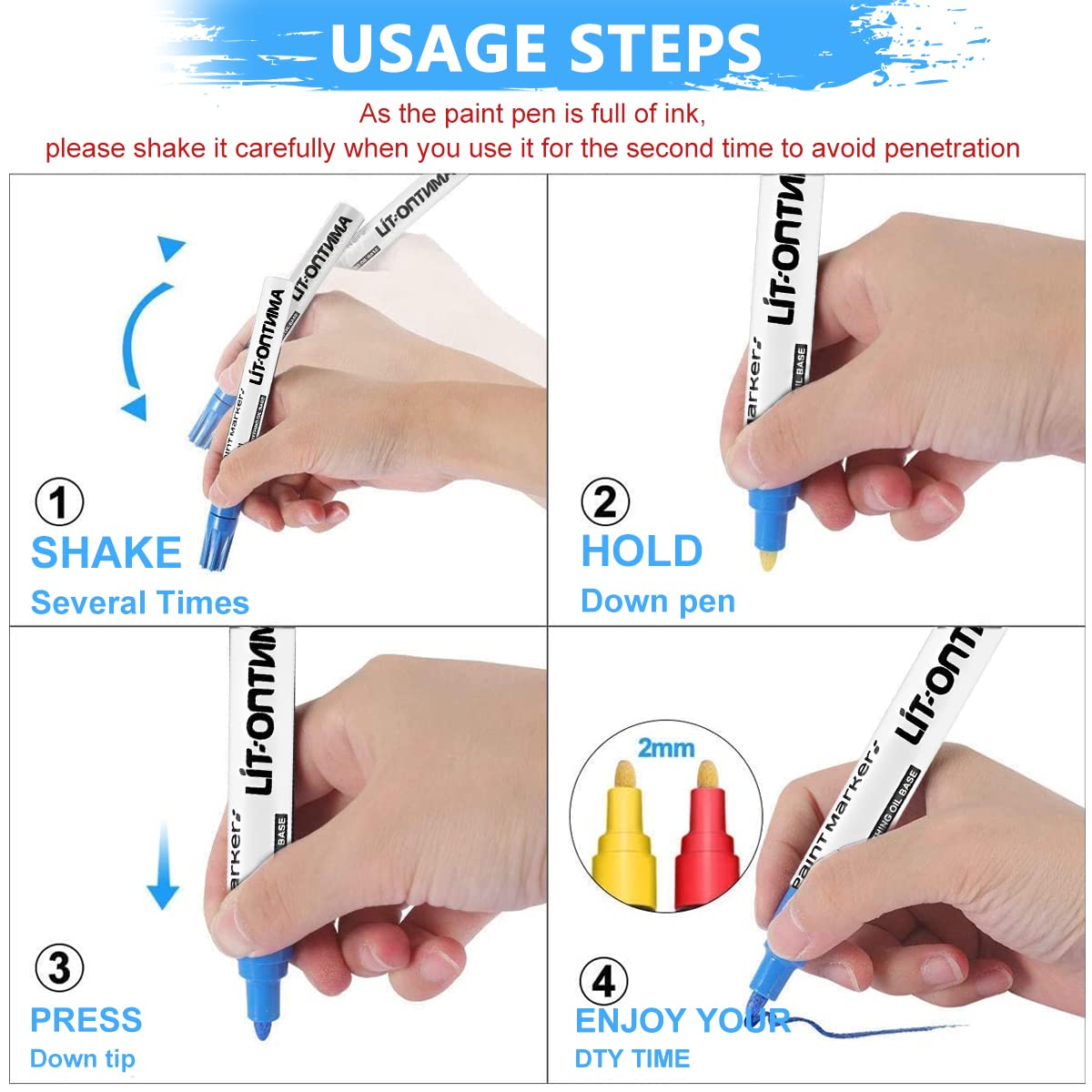- SAFE AND PREMIUM INK: Paint markers use vivid and opaque ink that can write on almost any surface. The ink is oil-based, non-toxic, low odor, quick-dry and waterproof. Designed for kids, adults, students, artists, and professional designers alike. Each color marker is bright and gentle color making beautiful colors on various materials. Note: When you are not using the pen, tighten the cap and place the pen horizontally.