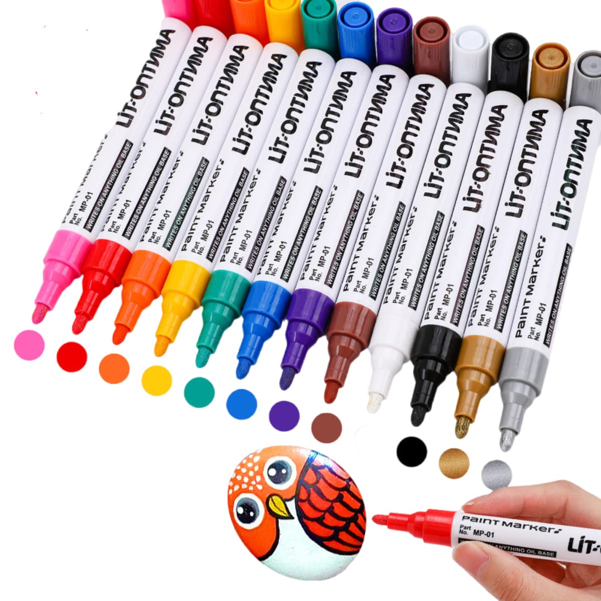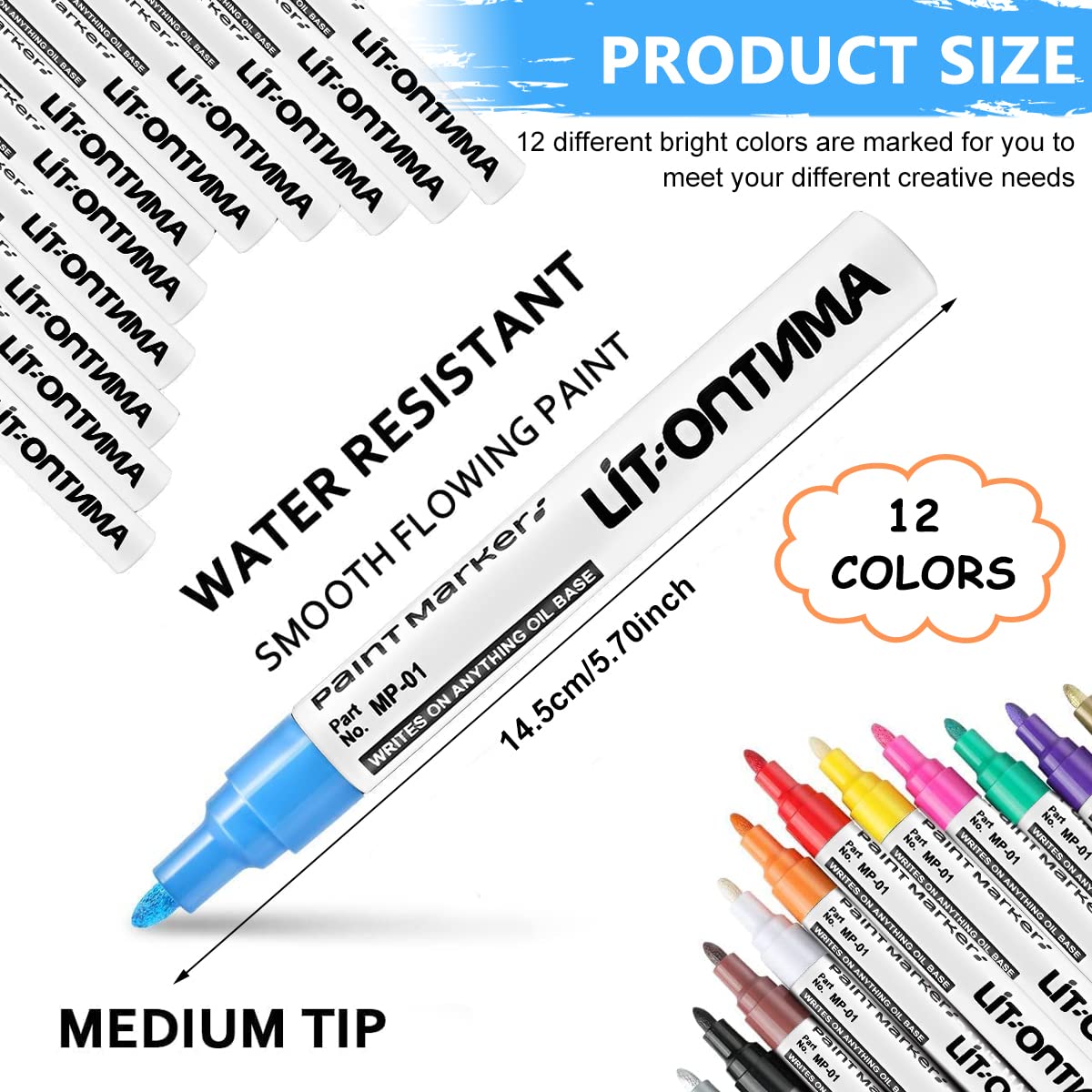 - 12-COLOR PAINT MARKER SET: Set of 12 color paint oil marker pen, includes 12 different bright color markers for you, meeting your different creation needs. Also practical wear resistant fiber pen nib allows you can use the paint marker on any material, and no leaking or smudge.