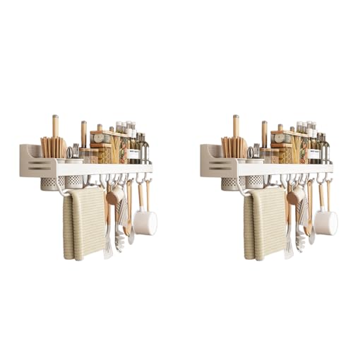 - KITCHEN RACK WALL MOUNTED: Designed to optimize kitchen organization, this Kitchen Organizer Rack Wall Mounted features specific sections for utensils, cutlery, small jars, seasoning jars, and more. includes multi-cutter slots, under-shelf hanging hooks, a utility shelf, and a towel rack, ensuring every tool or essential has its designated place to reduce clutter and boost efficiency