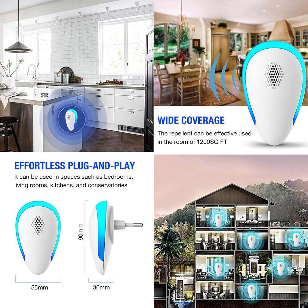 - EXTENSIVE COVERAGE AREA: Designed to secure an ample indoor space, our ultrasonic pest repeller extends its protective reach to cover up to 1200 square feet. This coverage is optimal for safeguarding most household and office areas, thereby ensuring that every corner remains under the shield of this efficient pest repellent.