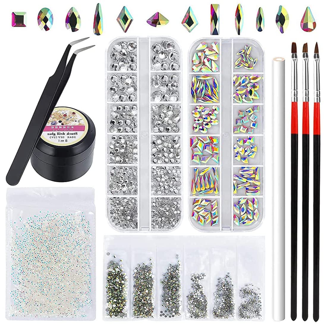 - Includes 120 multi-shape AB rhinestones, one box of clear rhinestones in multiple sizes, and one bag of AB rhinestones for versatile decoration.
