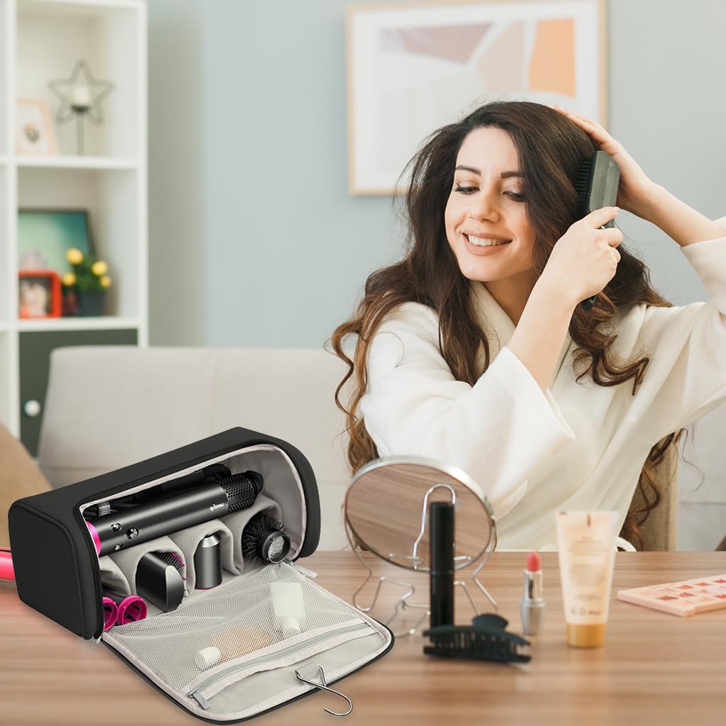 - HAIR STYLING TOOL ORGANIZER BAG: Crafted to accommodate various hair styling tools and accessories, this travel bag features five compartments and a mesh zipper pouch. Compatible with the Dyson series, it systematically organizes hair dryers, straighteners, curlers, and other accessories, ensuring they are sorted and readily accessible, enhancing your styling experience.