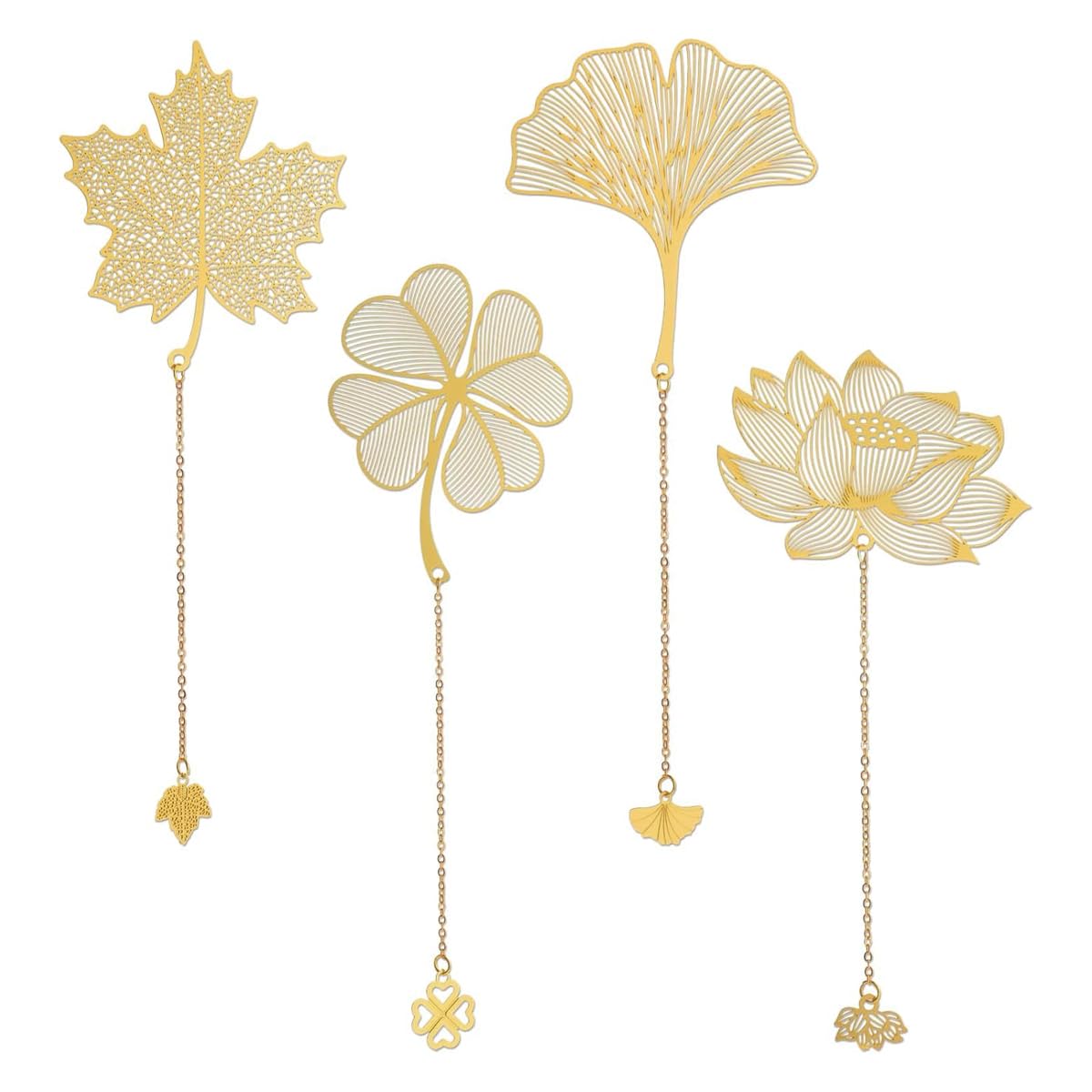 OFIFO 4 Pcs Metal Bookmarks with Chain offer a refined reading accessory designed for durability and elegance. Each golden floral cutout bookmark—featuring Ginkgo, Lotus, Four Leaf Clover, and Maple Leaf patterns—is crafted from sturdy metal that resists bending and tarnishing. The attached charm chain provides convenience and enhances aesthetic appeal, making it easy to locate your page in books, journals, or notebooks. With smooth, rounded edges that protect both fingers and paper, these vintage page markers combine function and style. Ideal as thoughtful gifts for book lovers, students, and office staff, OFIFO delivers reliable quality that enhances every reading experience.