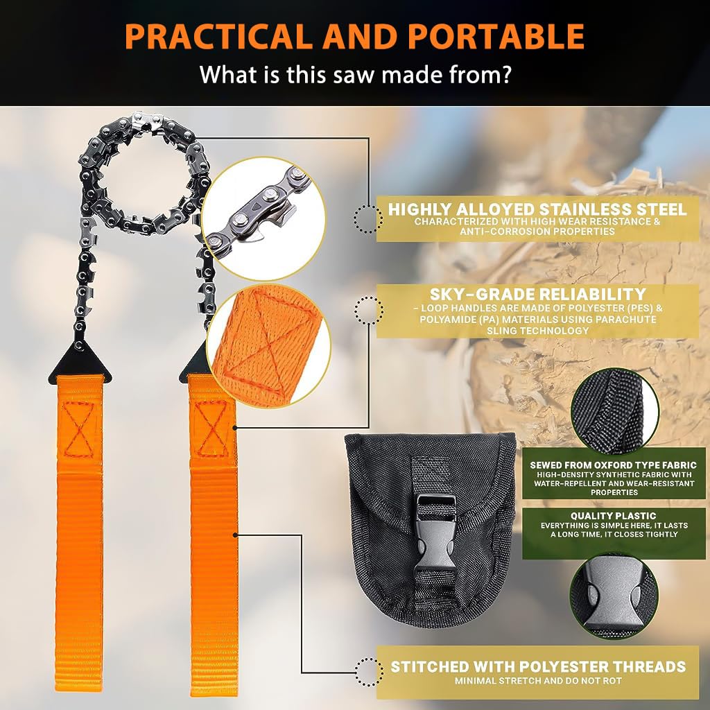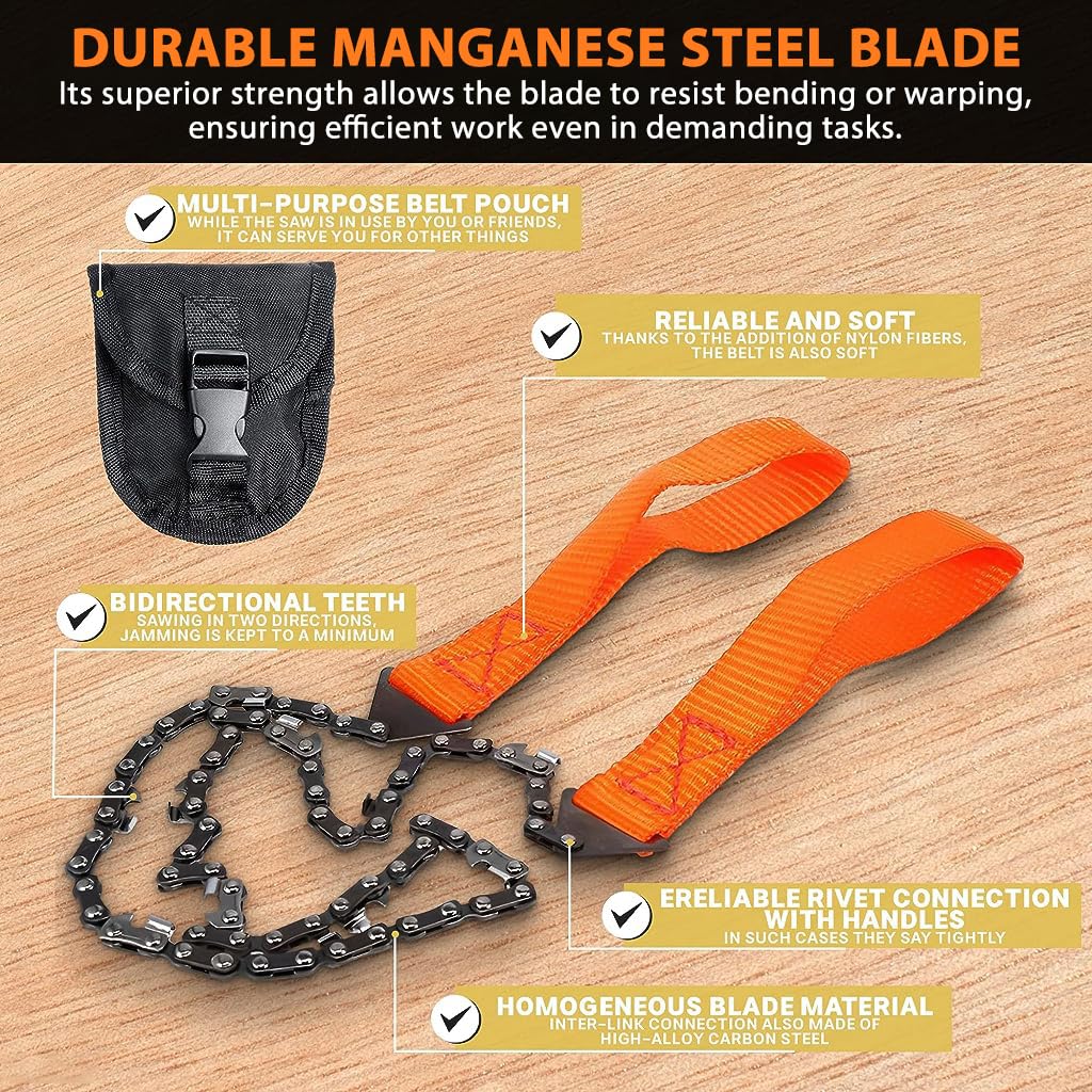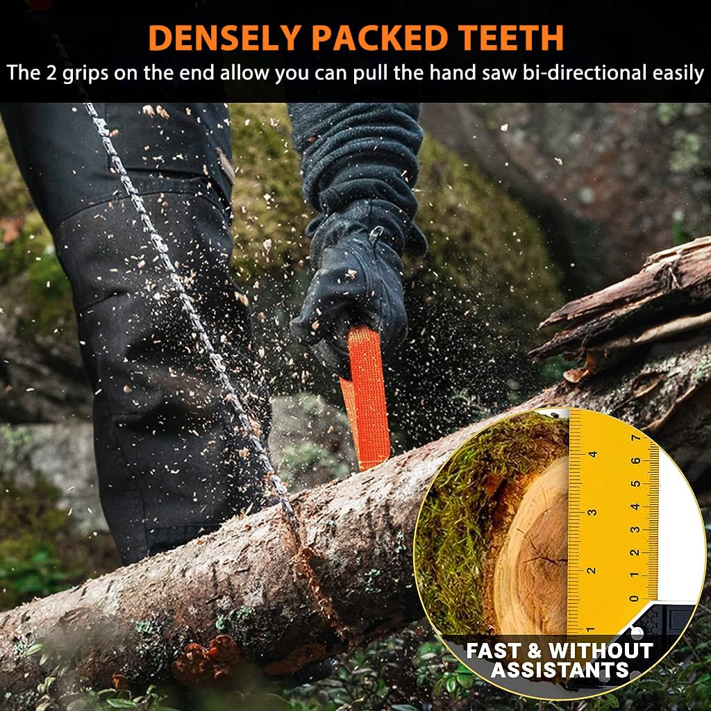 - EASY USE OF PORTABLE SAW: Our emergency rope chain saw boasts bi-directional cutting teeth that allow for quick and efficient cutting. With its three-sided blade, you can cut various tree branches with ease. Whether you need to clear a path, create firewood, or build a shelter, this hand saw is an essential tool that will undoubtedly come in handy during your outdoor adventures.