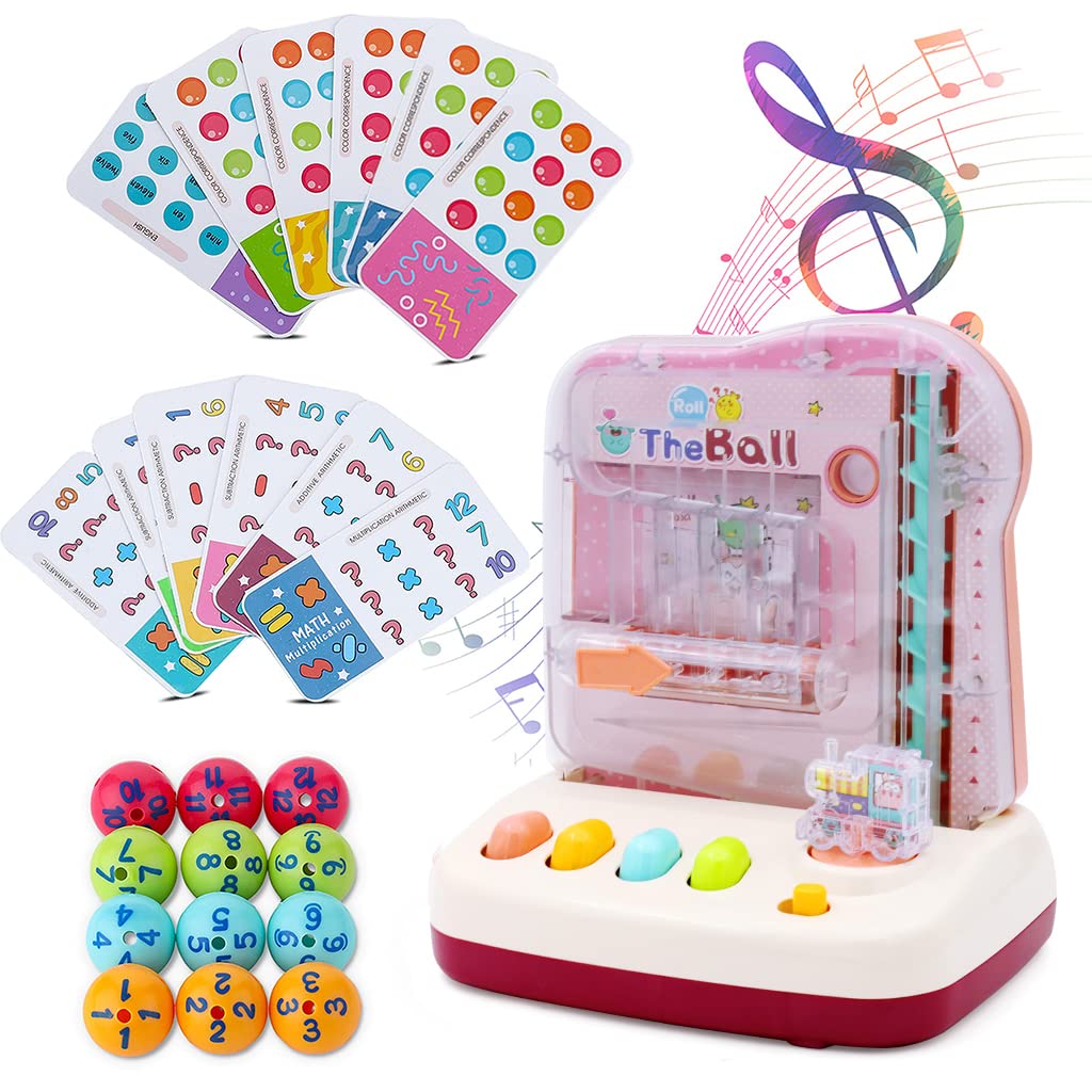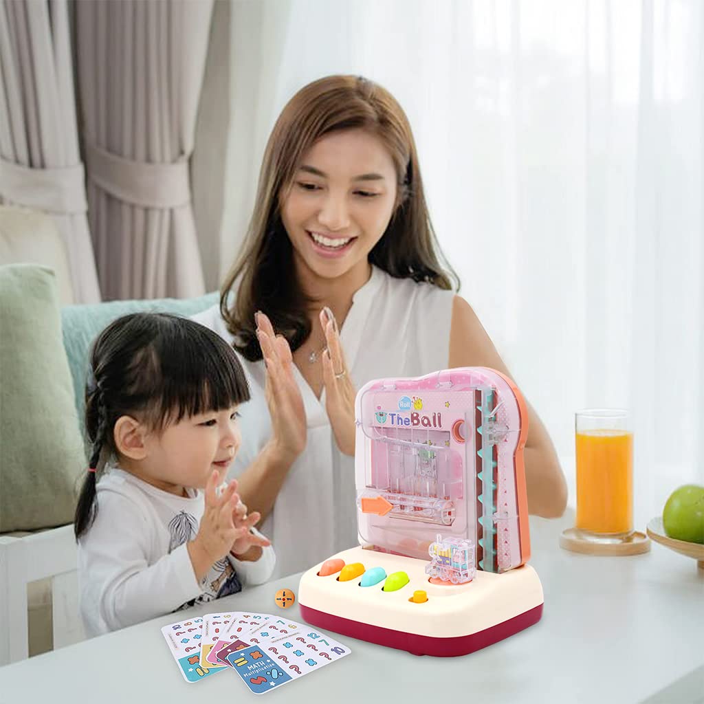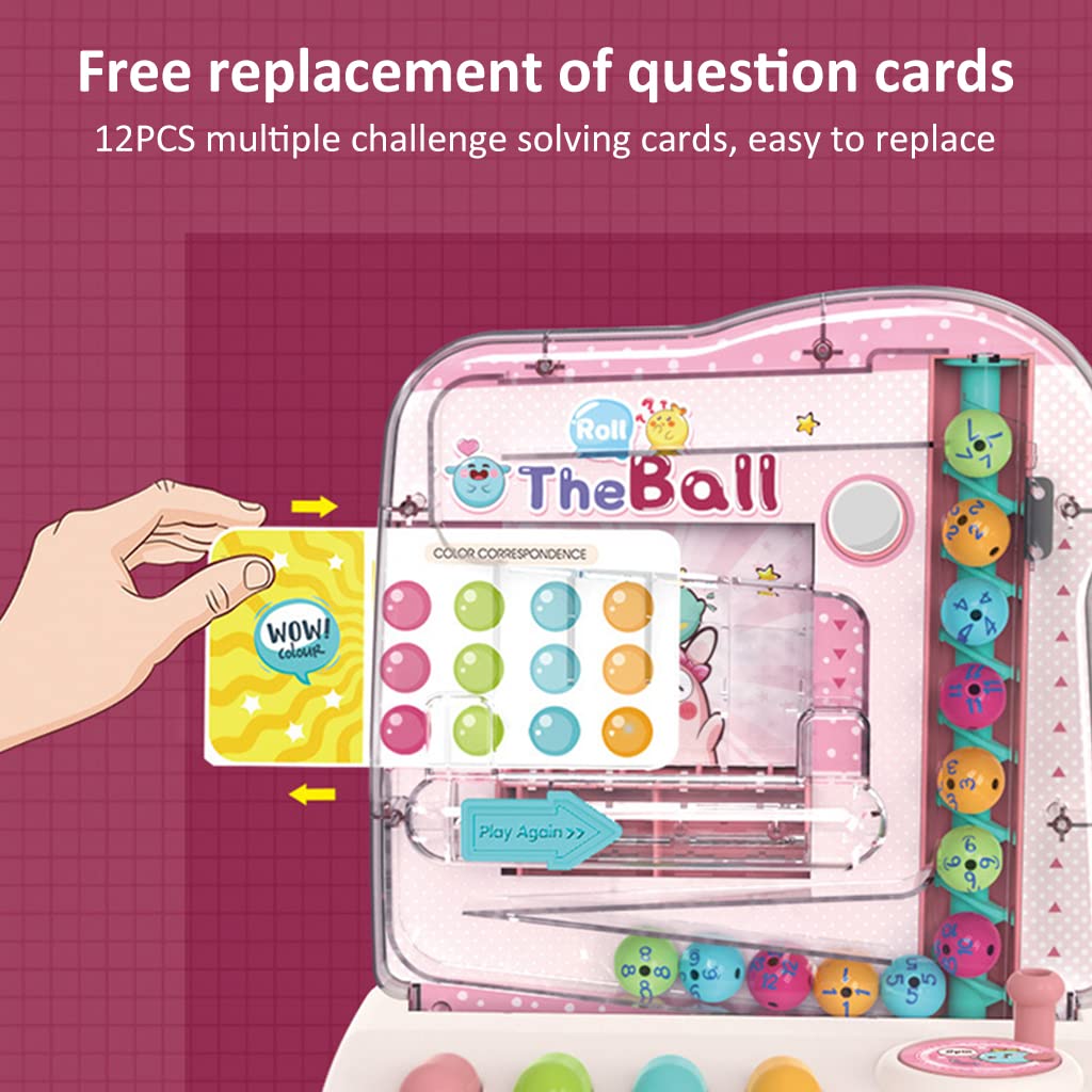 - STIMULATE KIDS BRAIN DEVELOPMENT: Upgrade and challenging new educational toy for kids combines classic mathmatic game and puzzle toy for kids, kids can control the handles and buttons on the rolling ball toy machine to make the color balls matching the game cards or complete simple addition calculation on the game cards.