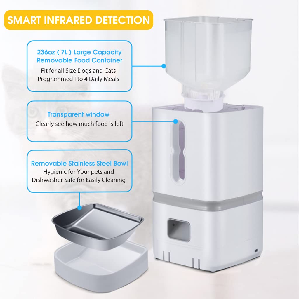 - SMART INFRARED DETECTION: Large food tank with visible window is convenient for your to refill food in time. Leakproof lid makes sure that your pet can have fresh food for each bite. The built-in infrared detection automatically suspend the cat feeder when an obstruction is detected. Keep your feeder in good condition and your pets safe.