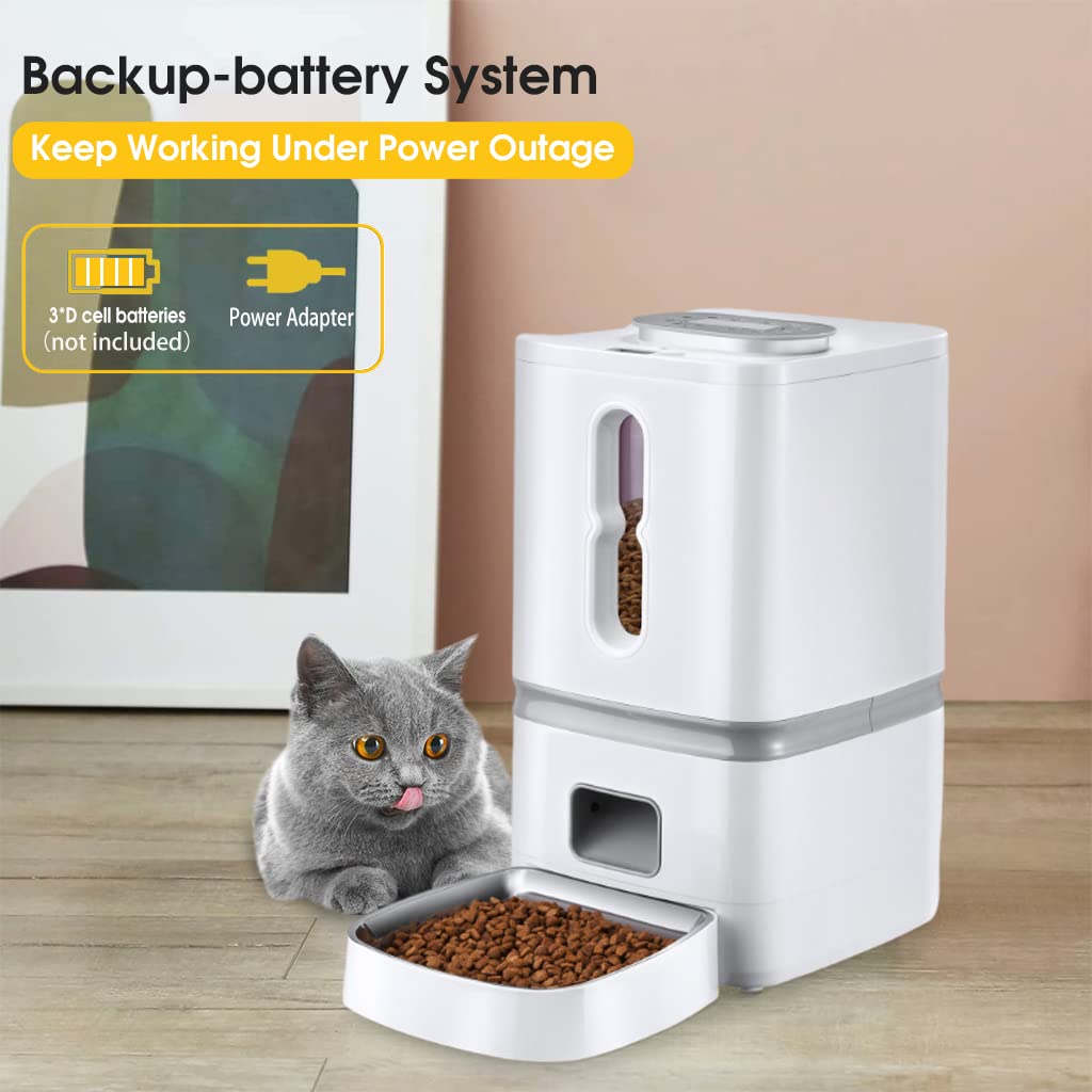 - 7L LARGE CAPACITY: The automatic pet feeder is designed as 6 large capacity, can ensure longer feeding for your pet when you are leaving, no more worry of your loved pet without feeding . Also can save you time and trouble of adding food frequently. The 7L large capacity can store various dry food of 5mm-15mm diameter, NOT FOR WET FOOD. The food containter and feeding bowl can be detachable for cleaning.