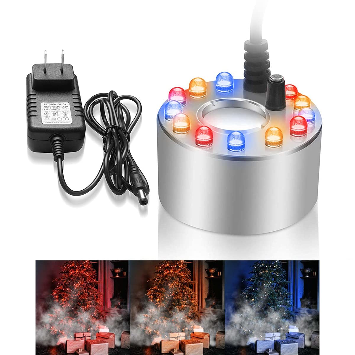 - Produces mist and visual lighting for small aquariums and fountains.