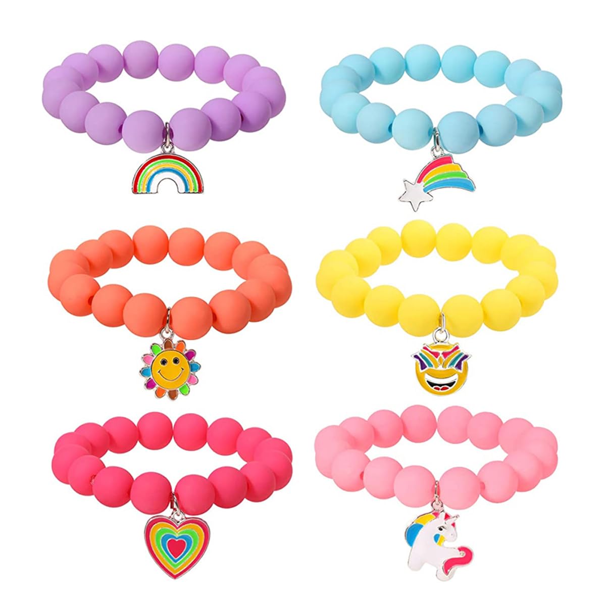 - Features six unique bracelets with colorful charms including unicorn, rainbow, heart, and star.