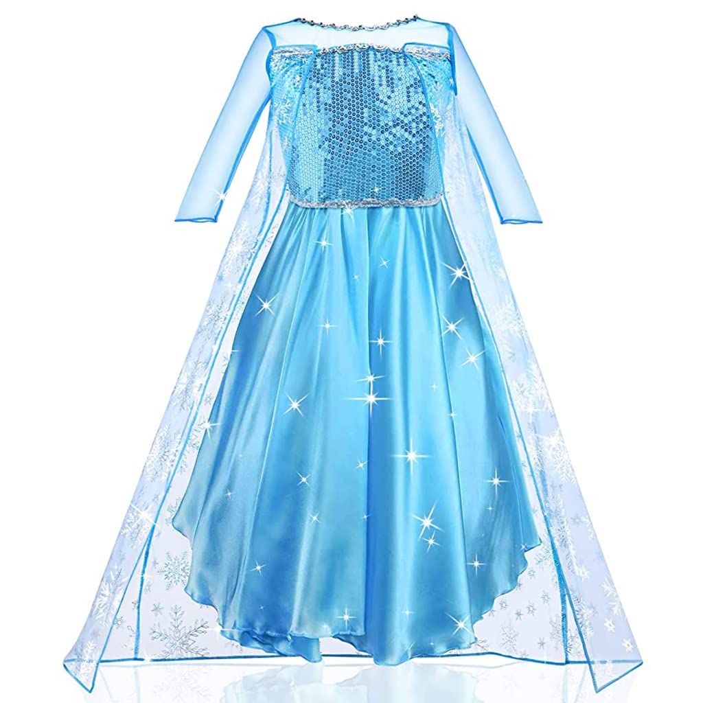 - Detailed sequin accents and a snowflake-patterned translucent cape recreate the iconic character style.
