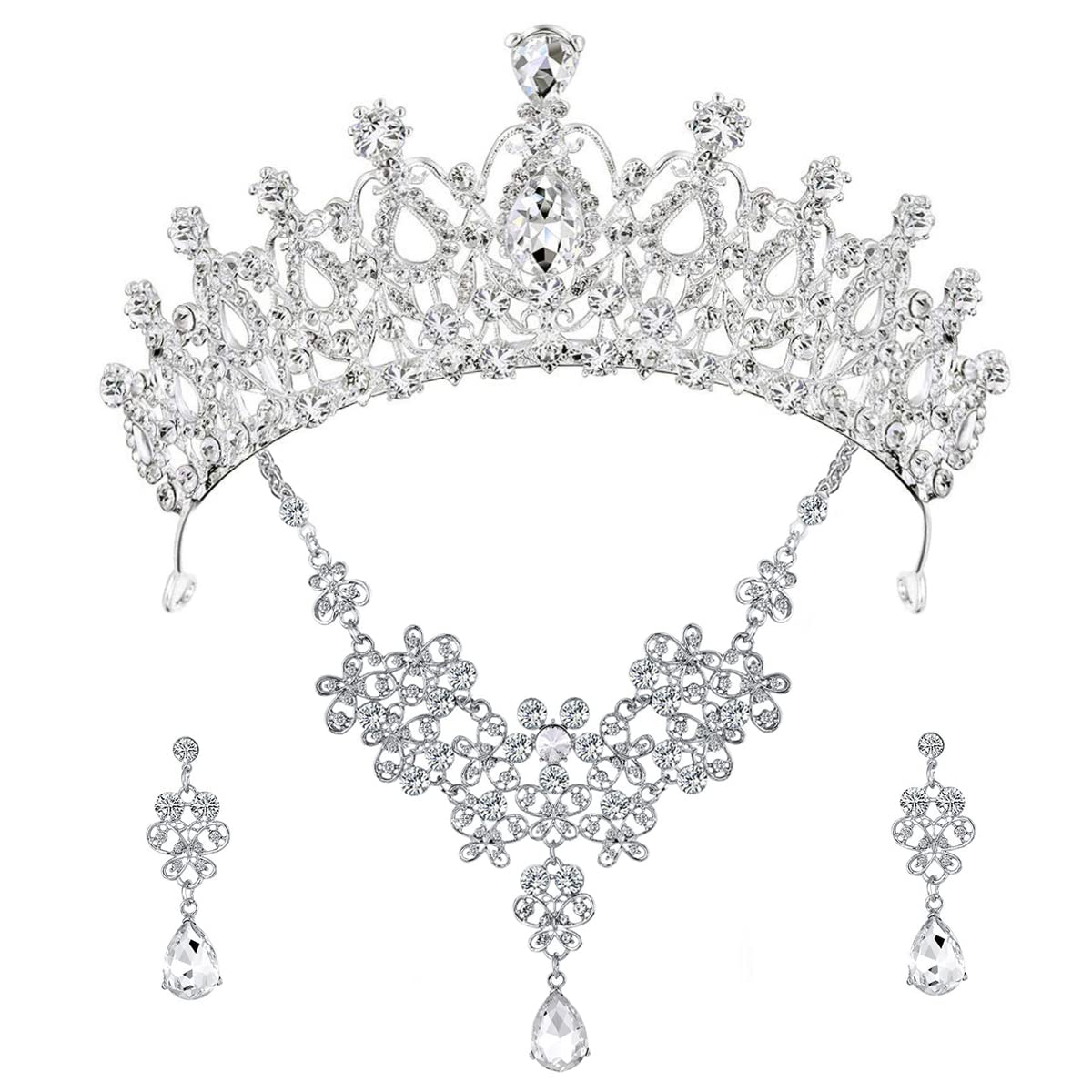 - Includes a necklace, a pair of eardrops, and a crown designed with elegant floral details.