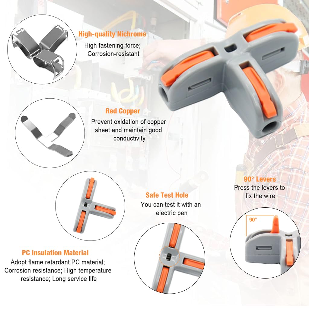 - EASY INSTALLATION: Say goodbye to the hassle of peeling, stripping, cutting, soldering, or welding wires with our innovative T type Wire Connectors. Designed with a simple push in desig and a lever design, these connectors make installation effortless and save you valuable time. Enjoy a cleaner and easier wiring process with our solderless solution.