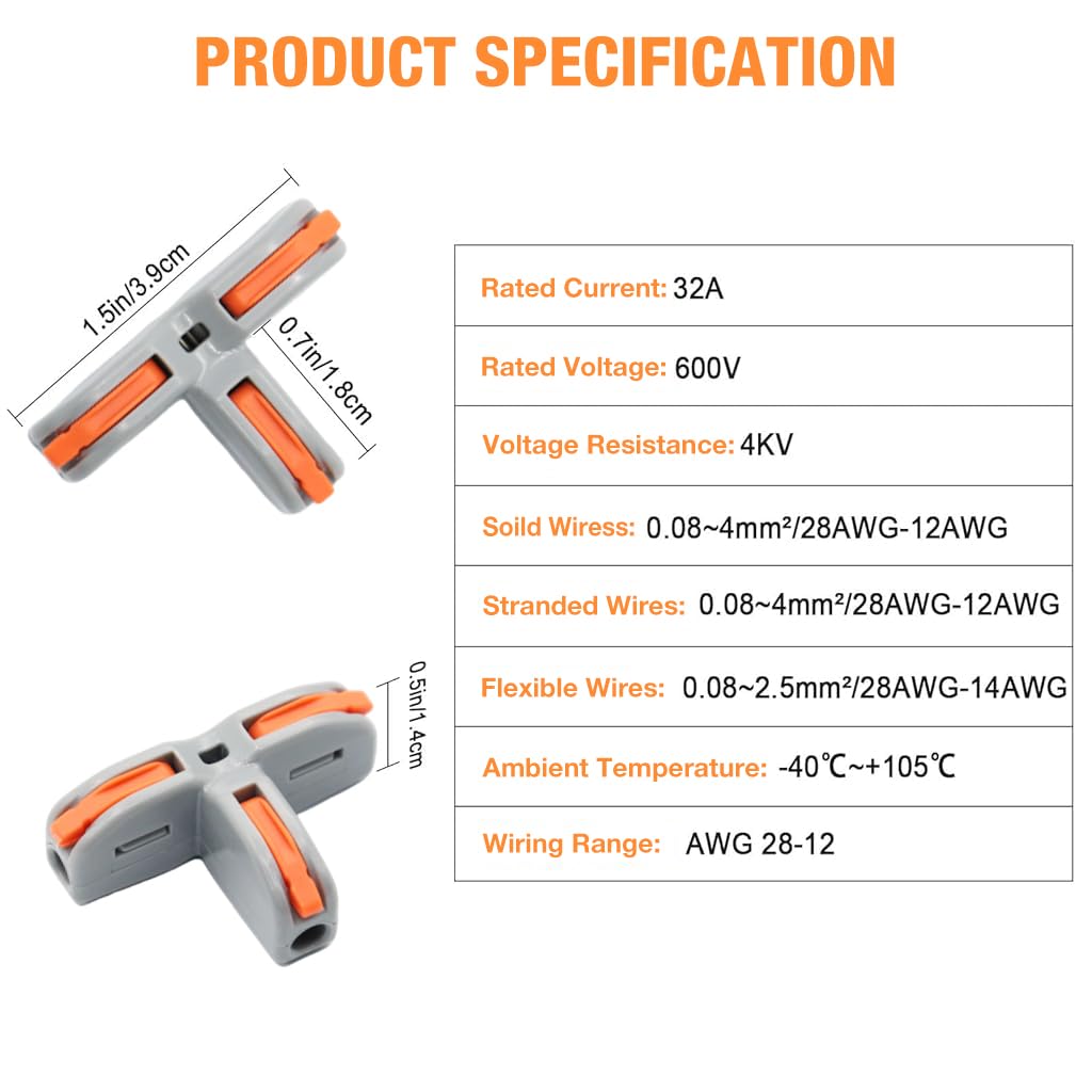 - T-SHAPE 3 WAY WIRE CONNECTOR: The wire connector is a versatile solution for joining multiple electrical wires together. Unique T shape design, these tee wire connector enables you to splice into a wire without cutting, stripping, or soldering the wire. This not only simplifies the installation process but also saves time and reduces the possibility of errors.
