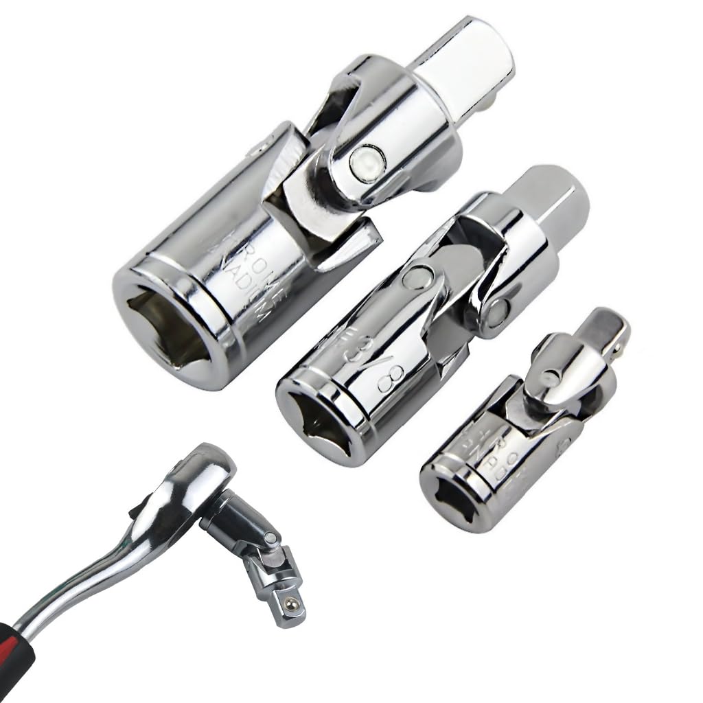 Serplex 3Pcs Swivel Drive Adapters for Ratchets feature durable CR-V steel construction with a polished silver chrome finish that resists corrosion and wear. Each adapter—available in 1/4", 3/8", and 1/2" sizes—offers reliable performance across various mechanical and automotive tasks. The smooth multi-angle swivel design improves maneuverability, allowing users to reach fasteners in tight or angled spaces efficiently. Compatible with ratchets, wrenches, and power drills, these adapters provide flexibility for both professional and DIY applications. Built to enhance tool accessibility and longevity, the Serplex set helps users complete maintenance or repair jobs with precision and confidence.