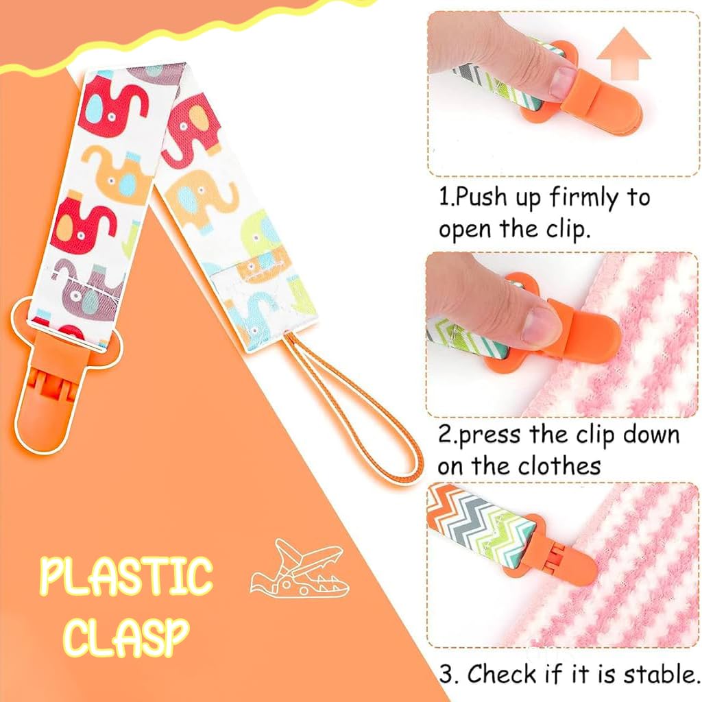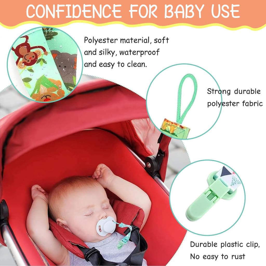 - CHILD-SAFE MATERIAL: Constructed with premium polyester and sturdy PP clips, our pacifier holders prioritize your baby's safety and comfort. They are resilient, machine-washable, and designed to retain their form and function, all while ensuring a gentle grip on your baby's clothing.