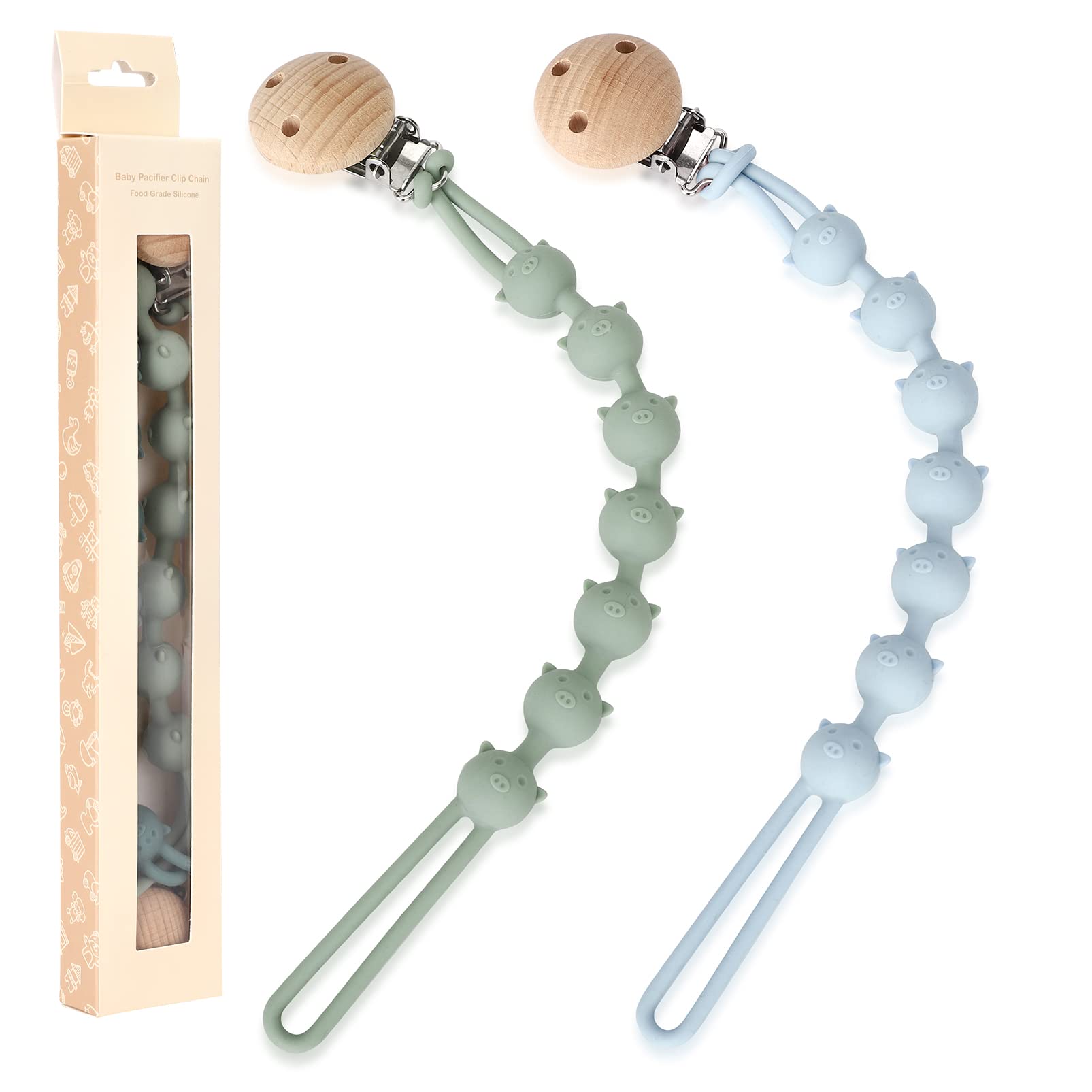 - Comes as a set of two pacifier chains in box packaging, suitable as a baby gift.
