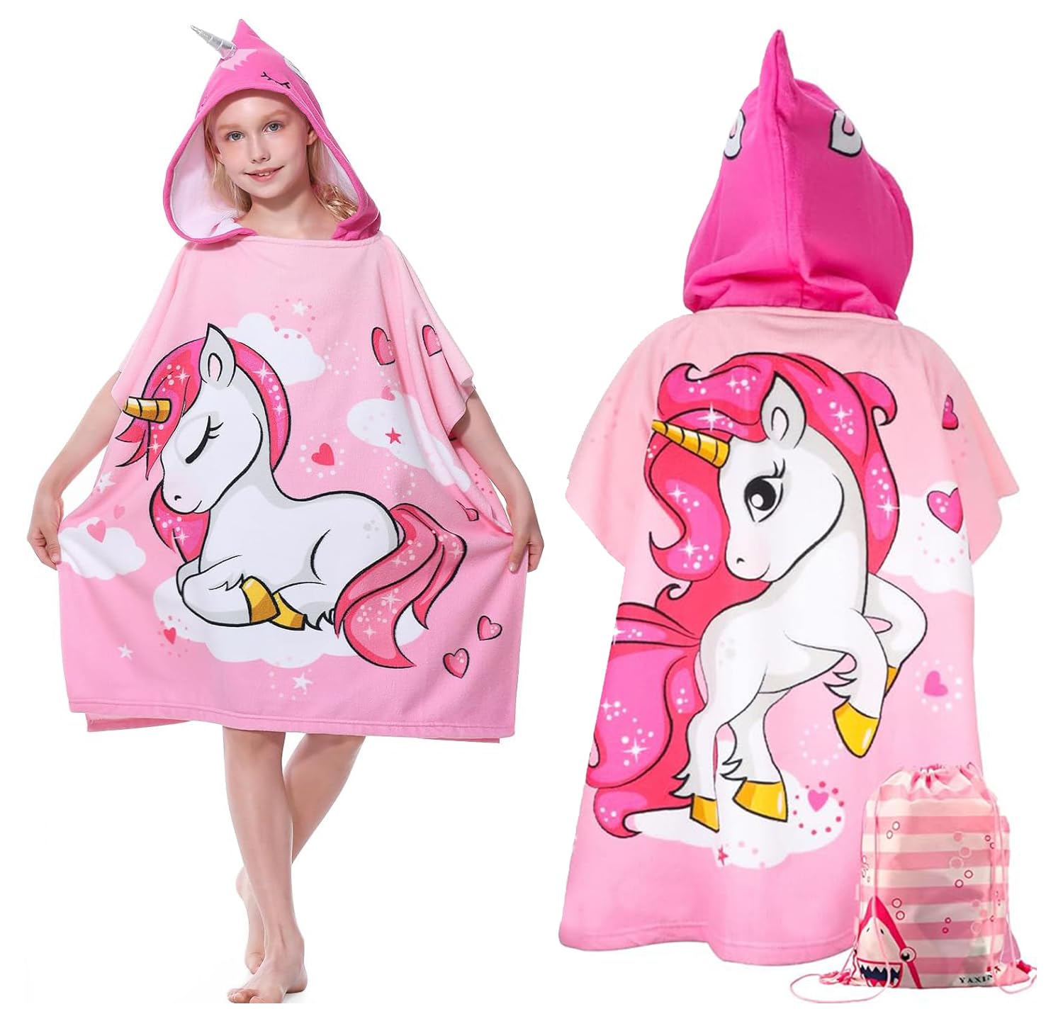 SNOWIE SOFT Bath Towel for Kids Girls Pink Unicorn Print Bath Towel Cloak offers a soft, absorbent, and whimsical option for children's bath time. Designed with a playful unicorn print and a silver horn on the hood, this hooded cloak engages a child’s imagination while keeping them cozy. Crafted from gentle, finely woven fibers, it provides a skin-friendly touch that ensures comfort for delicate skin. The towel’s superior absorbency helps dry the body efficiently after bathing or swimming. Measuring 75 x 150 cm, it accommodates children ages 3 to 10, and its matching drawstring bag makes it easy to carry for beach trips or travel, reflecting SNOWIE SOFT’s focus on comfort and quality design.