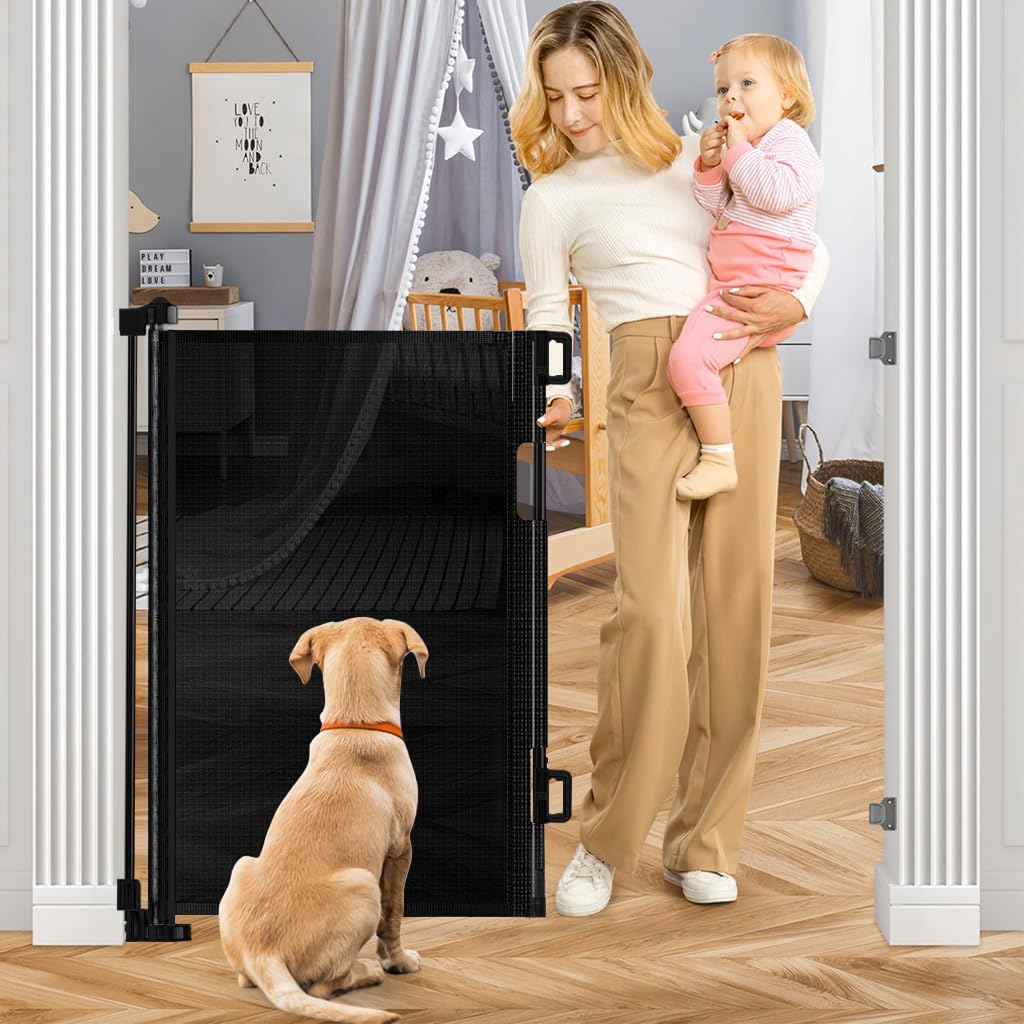 SNOWIE SOFT® Versatile Retractable Baby & Pet Safety Gate is a sturdy, space-saving barrier designed for staircases, doorways, and living spaces. Featuring a smooth one-hand open and close mechanism, it provides quick access while ensuring the safety of toddlers and pets. The easy, hassle-free installation with pre-punched screw holes allows users to mount it securely without drilling. Its adjustable design fits openings up to 59 inches wide and stands 33 inches tall, offering flexibility for various home layouts. Durable materials ensure dependable protection for children and small to medium pets. This sleek black gate delivers reliable safety and peace of mind through thoughtful design and trusted SNOWIE SOFT® quality.