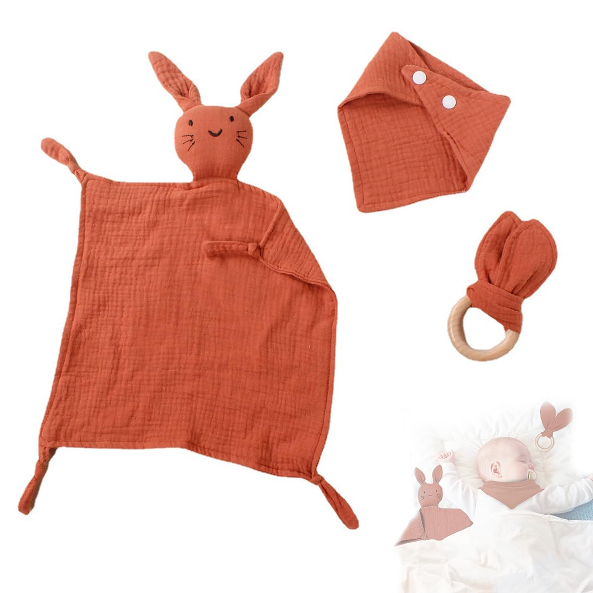 - SNOWIE SOFT Baby Soothing Comforter Set with Wooden Teether and Cotton Bib | 3pcs for 0–12 Months SNOWIE SOFT Baby Soothing Comforter Set with Wooden Teether and Cotton Bib | 3pcs for 0–12 Months