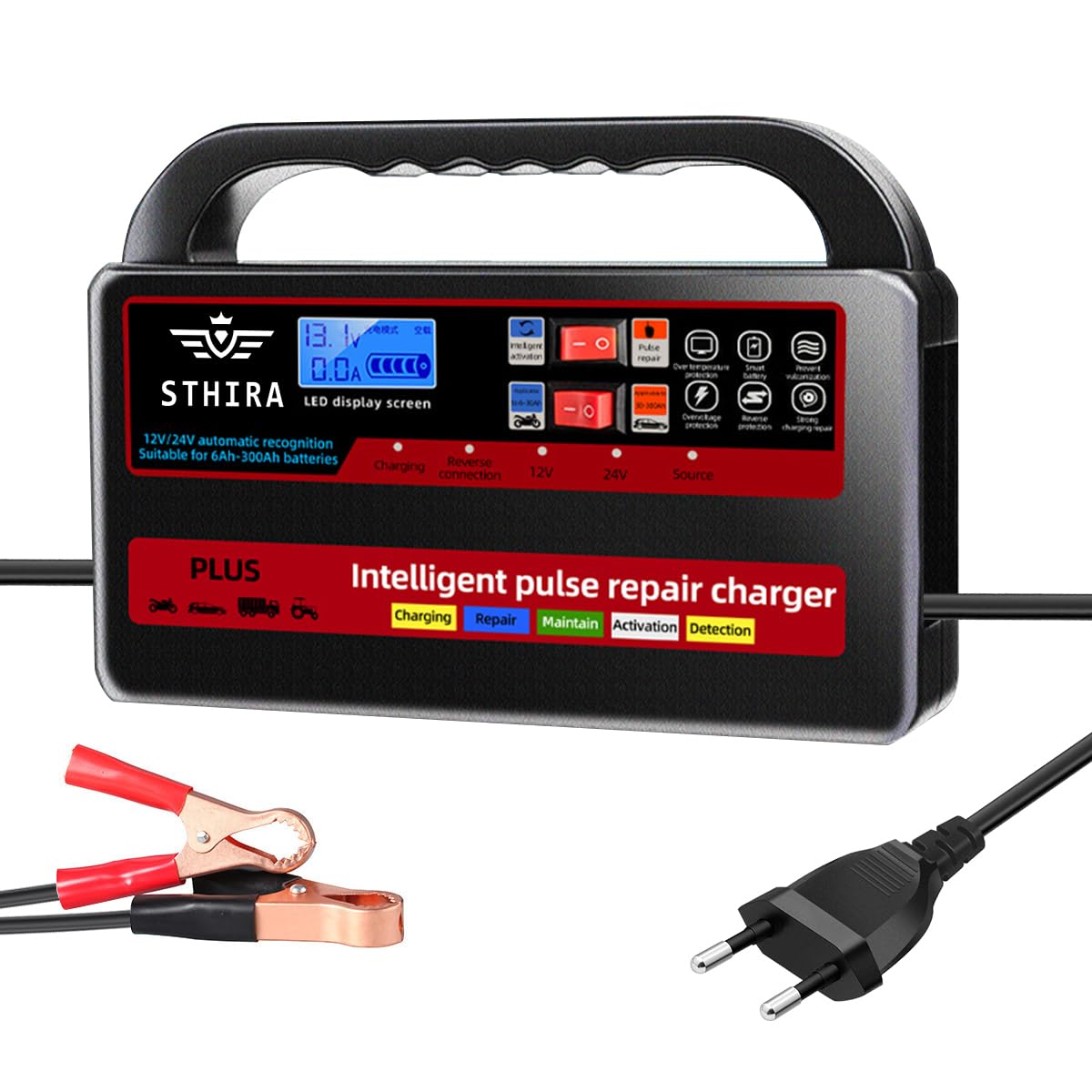 STHIRA Intelligent Pulse Battery Repair Charger Universal 12/24V Vehicle Battery Charger delivers dependable automatic charging performance for a wide range of vehicles including cars, motorcycles, and boats. It features smart automatic charging technology that supports both 12V and 24V lead-acid batteries, ensuring efficient energy transfer and safe operation. Its pulse repair function helps restore battery capacity by reducing internal resistance and improving performance. A clear LCD display provides real-time voltage and charge status, while multilayer safety protection prevents overcharging and reverse polarity issues. Compact and well-organized, this STHIRA charger ensures hassle-free battery maintenance and a longer battery lifespan for reliable everyday performance.