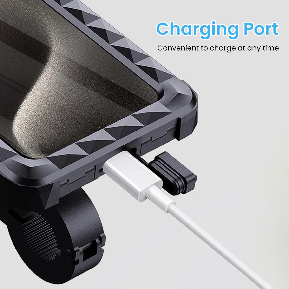 - FULL ENCLOSURE PROTECTION: This bike phone mount is meticulously crafted with a full enclosure design and a snap-on closure system. It offers comprehensive protection for your device against environmental elements while maintaining seamless access to its functionalities during rides. A robust, clear touch-screen window accommodates phones ranging from 5.5 to 6.9 inches.