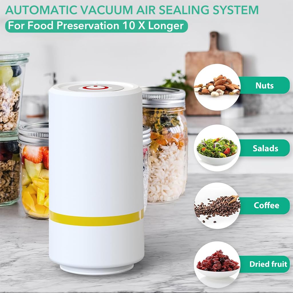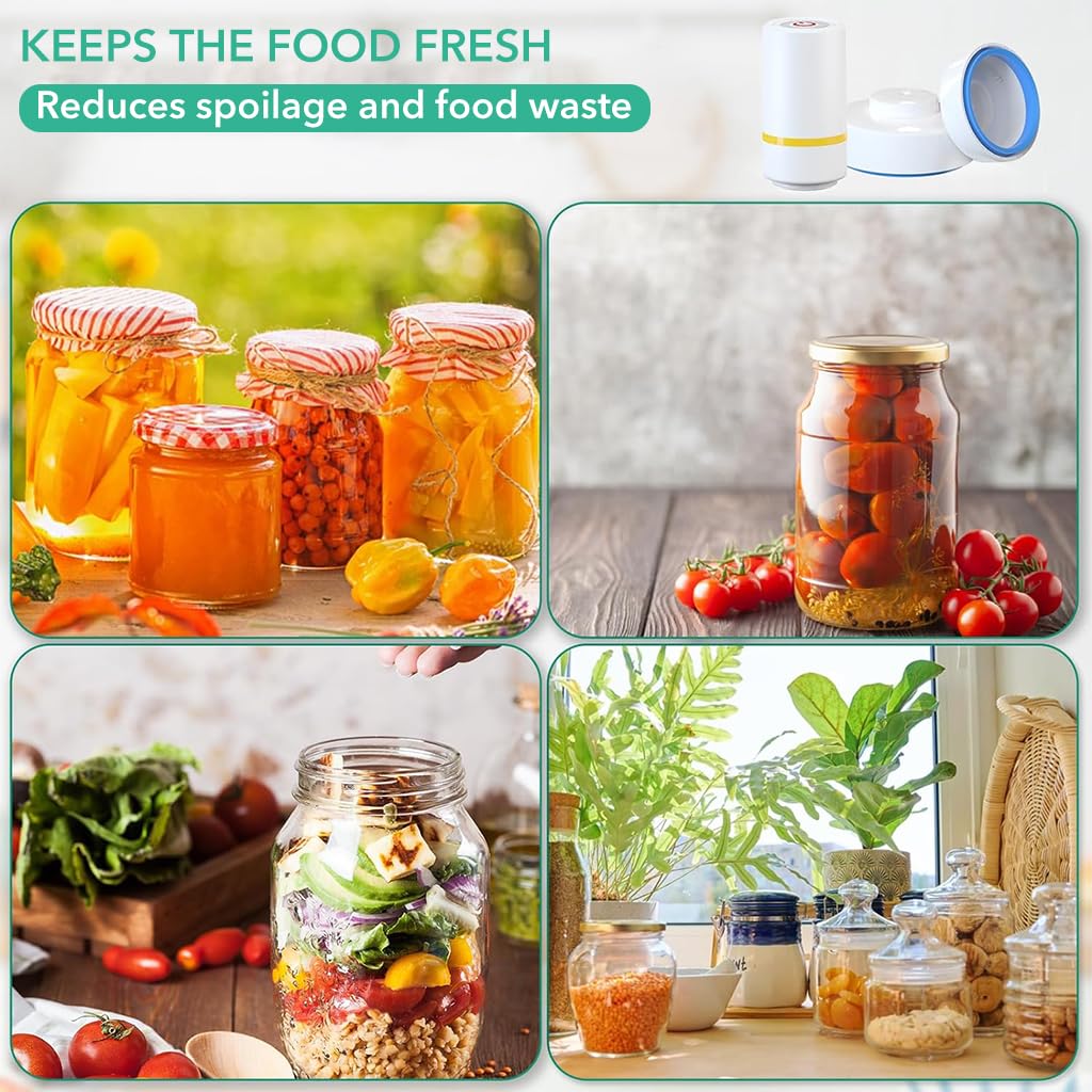 - PRACTICAL VACUUM SEALER KIT FOR MASON JAR: Keep the food or items stay away moisture, prolong the food freshness and preventing odors and oxidation, get a healthy and fresh food. Mason jar is commonly used for pickled food or dry food, including grain, nuts, etc, with a vacuum sealer kit let the mason jar sealing be more easier and productive, getting rid of complex and tradition sealing method. The portable vacuum pump is very easy to carry when traveling, camping and outdoor activities!