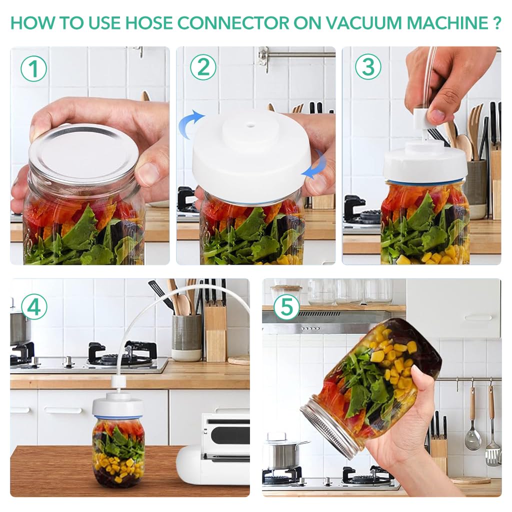 - COMPREHENSIVE MASON JAR VACUUM SEALER MACHINE KIT: This mason jar vacuum sealer machine kit includes everything you need to complete an perfect air tight mason jar. Includes: 1* Wide-mouth sealer, 1* Regular-mouth sealer, 2* House connector, 1* Electric vacuum pump, 1* Lip opener(for easily open lid), 2* Wide-mouth jar lids, 2* Regular-mouth jar lids, 1* User Manual. Vacuum sealer kit will help you remove the air from the mason jars and extend the life of your stored food.