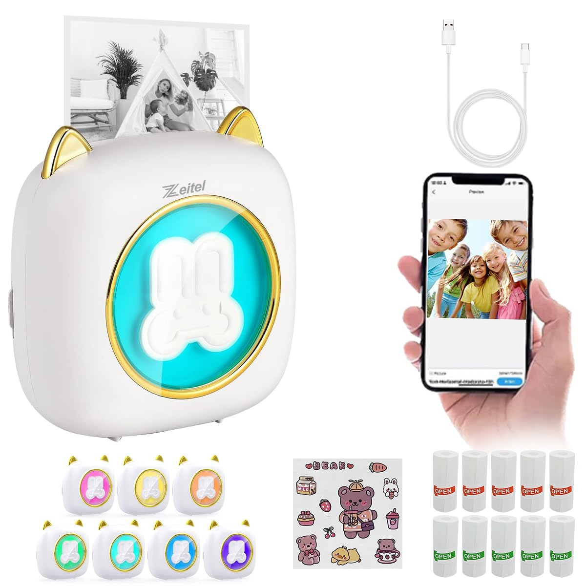 ZEITEL Mini Bluetooth Thermal Printer is a compact ink-free printing device designed for creating labels, notes, and stickers through a Bluetooth connection. Compatible with both Android and iOS, this thermal printer uses heat-sensitive paper to deliver clear 200 DPI results without requiring ink cartridges. Its integrated LED light offers seven color options, adding a playful element to everyday tasks. The printer comes with 10 rolls of printing paper, including adhesive types, ensuring practical daily use for study, office, and home organization. With portable dimensions and easy app control, ZEITEL combines creative functionality with reliable performance for children and adults who value efficient and enjoyable printing experiences.