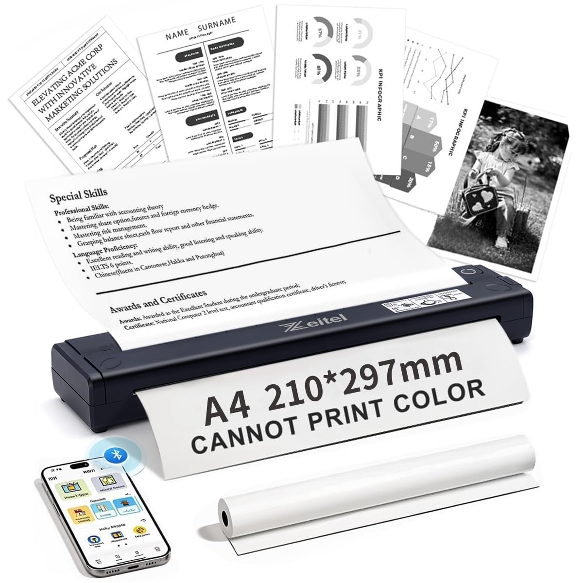 Zeitel Wireless Bluetooth Printer A4 Size offers an efficient and portable thermal printing solution for home, study, or travel use. Designed for inkless operation, this mini A4 thermal printer connects easily via Bluetooth through the iPrint app for Android and iOS or via USB to computers for plug‑and‑play convenience. With HD 203 DPI technology, it produces crisp black‑and‑white text and images using only A4 thermal paper. Its compact 2.24 × 10.62‑inch design ensures reliable performance and easy portability. Ideal for documents, notes, and contracts, the Zeitel printer provides a practical way to print with confidence and reliability backed by the brand’s expertise in mobile printing technology.