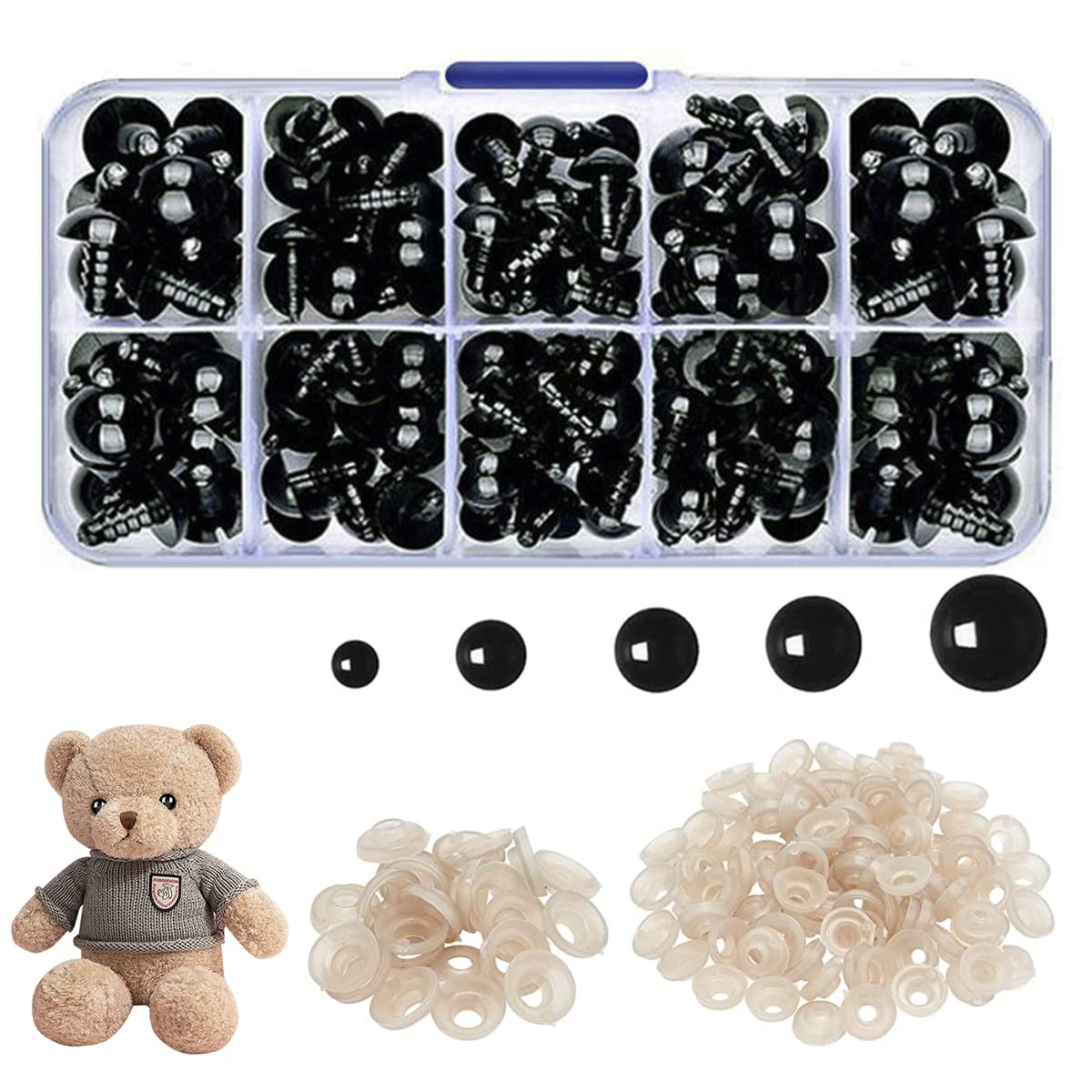 - Set includes 142 black safety eyes with washers in five assorted sizes for versatile application.