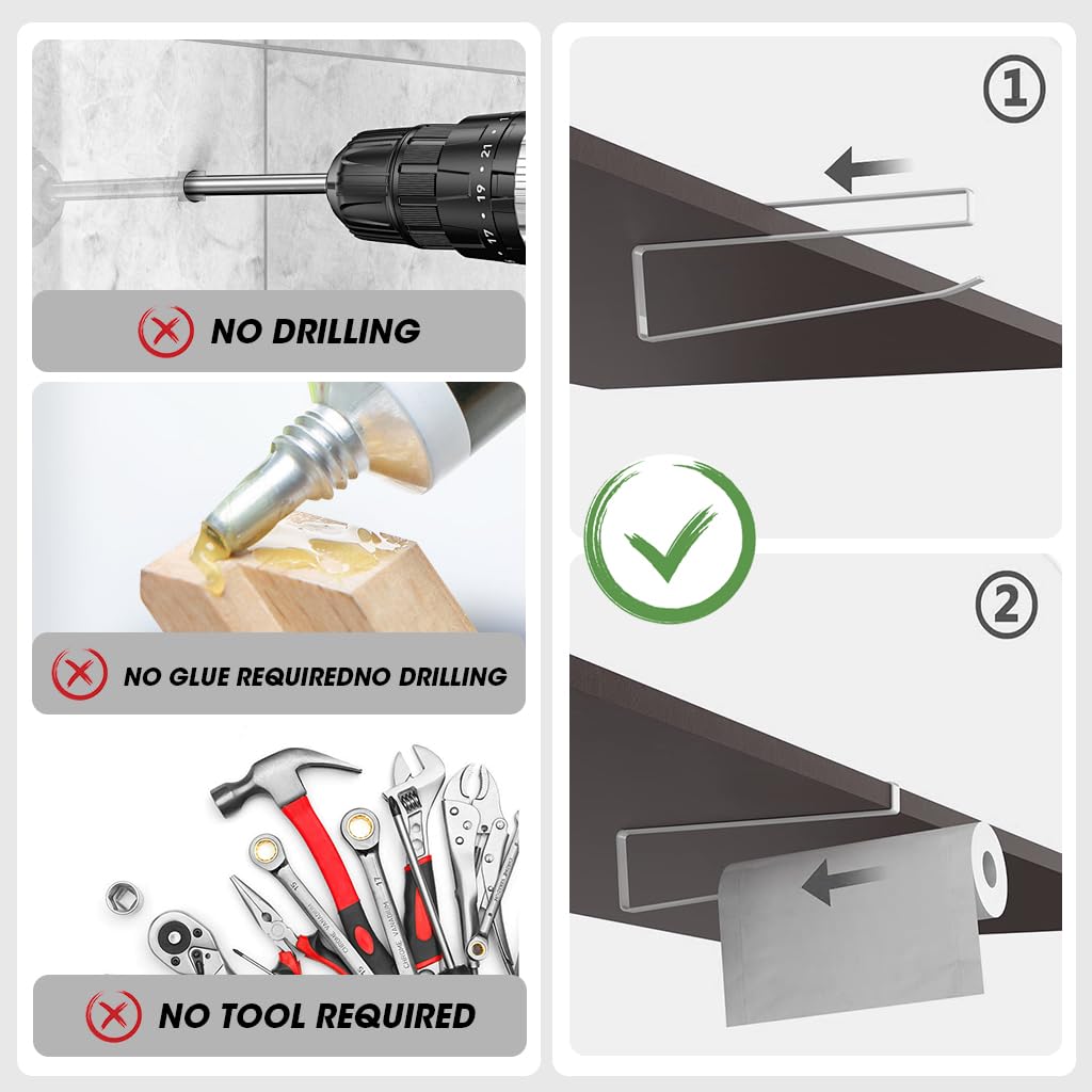 - SPACE SAVING: Maximize your kitchen space with our innovative tissue roll holder for kitchen that can be installed vertically or horizontally. Sliding seamlessly under shelves or inside cabinets, it ensures your counter space remains clutter-free. Ideal for kitchens with limited counter space, as well as dorm rooms, garages, and workshops. Keep your work areas organized and clear, and upgrade your space today!