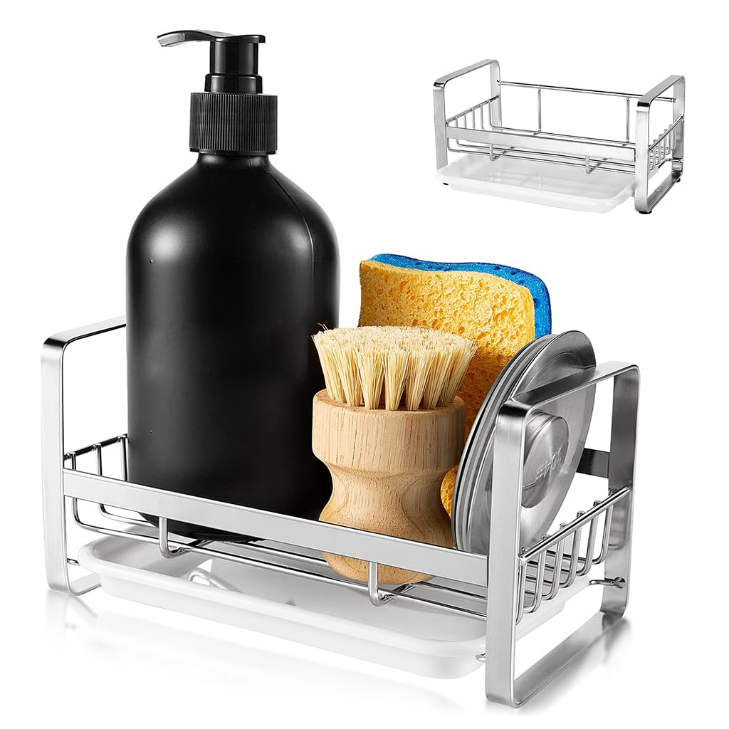 ZIBUYU® Sink Organiser in Kitchen Stainless Steel Soap Holder for Kitchen is made from high-quality stainless steel that provides durability, corrosion resistance, and reliable performance in daily kitchen use. Designed with a compact, space-saving structure, it efficiently holds dish cloths, sponges, and other cleaning tools while keeping the countertop organised. The removable drainage tray helps collect excess water, preventing moisture buildup and maintaining a clean surface. Its versatile installation allows both wall mounting and countertop placement to suit different kitchen layouts. With a sleek and modern appearance, this stainless steel organiser combines functionality and style, helping users maintain a tidy, efficient, and hygienic kitchen setup supported by ZIBUYU® quality.
