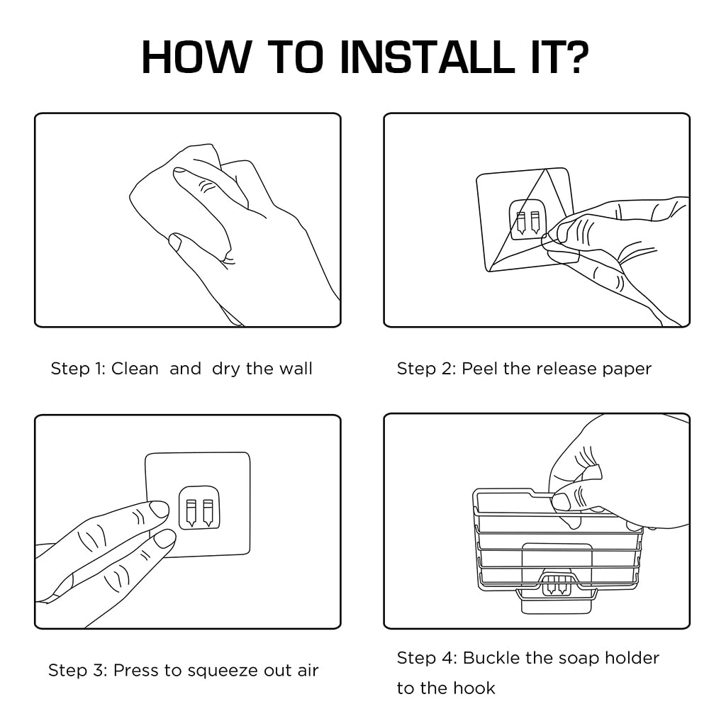 - EFFORTLESS INSTALLATION: Embrace simplicity with a no-drill, tool-free setup. Just peel the protective layer off the adhesive hook, press against the wall to expel air bubbles, and click the soap holder in place.