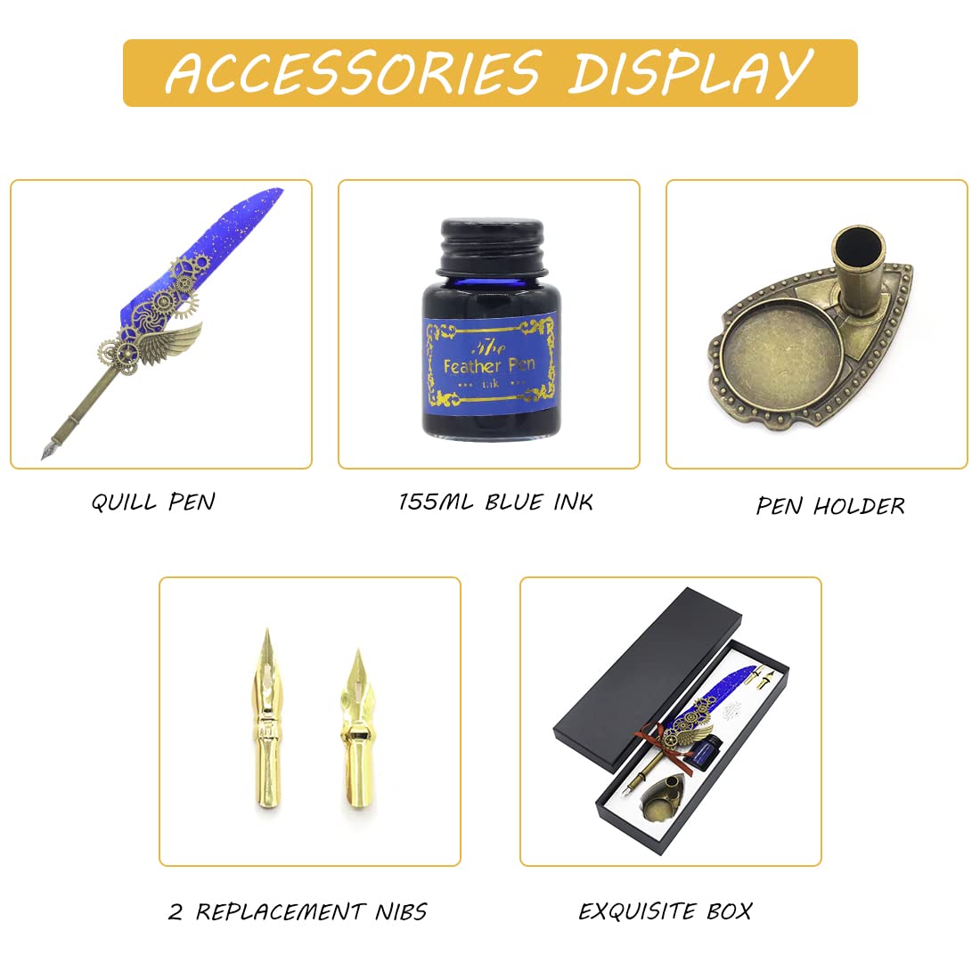 - [Vintage Quill Pen Set]--The Set contains: Steampunk Quill Pen, 2 Replaceable Pen Nibs for Different Line Weights, Pen Holder, 20ml Bottle of Blue Ink.