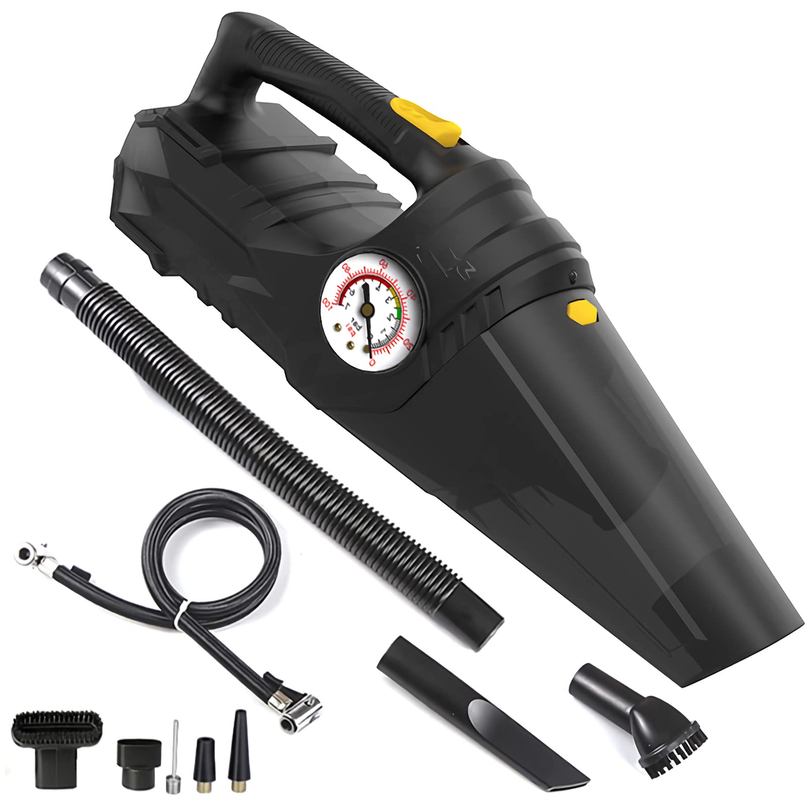 - Combines vacuuming, air compression, inflation, and tire pressure measurement in one portable device.
