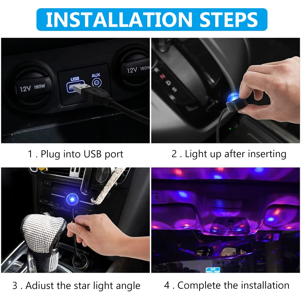 - USB PLUG AND PLAY: Easy to use, very convenient to use, can be powered by power bank, car USB interface or any adapter. USB design, the USB car roof atmosphere starry sky lamp can be powered immediately by connecting it to any USB port. Such as mobile phone chargers, car chargers, laptops, desktops, power banks and other electronic products with USB interface. Small indoor projector, portable, long working time, up to 5000 hours and consumes very little heat and electricity.