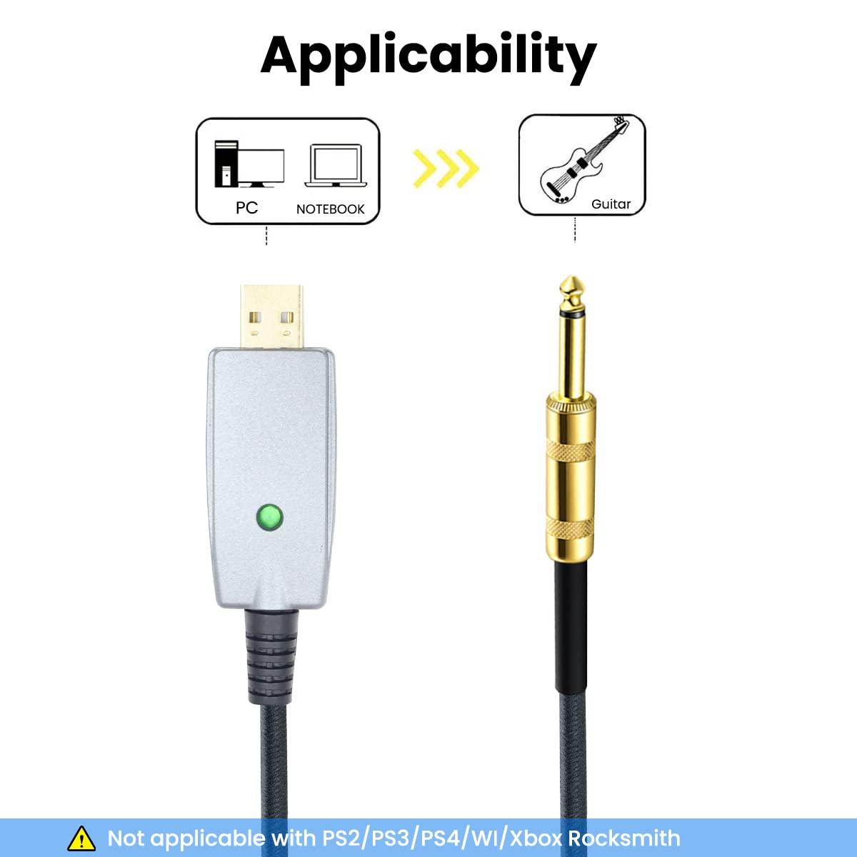 - WIDE COMPATIBILITY: This USB guitar cable plug and play. The guitar cord compatible with compatible with Windows 98SE / 2000 / XP / VISTA / Win7/Win 8 / Win 10 System. Compatible with most recording software like Guitar Combo Amps, Audacity, Amplitude.