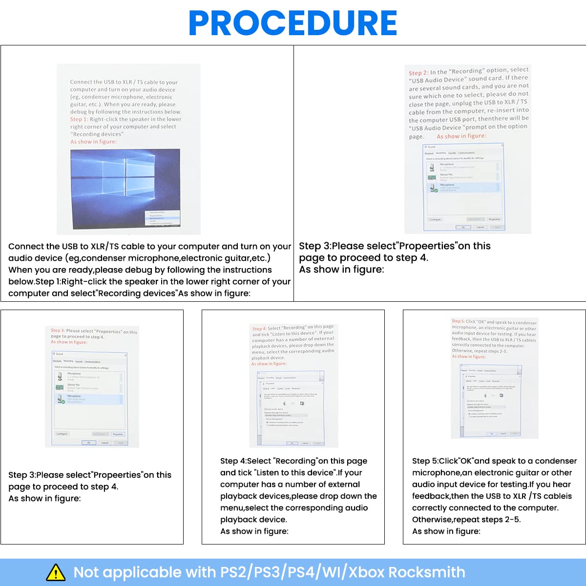 - USB TO XLR FEMALE MICROPHONE CABLE:Package included: 1x USB Microphone Cable, 1x User's Manual, 1x Cable Ties.This USB guitar cable is a great way for the average player with a guitar, a PC and some open source software. The guitar cord will perform satisfactorily and also provide some enjoyment. The USB guitar cable works great with different guitars, pickups, pedals, mixers etc
